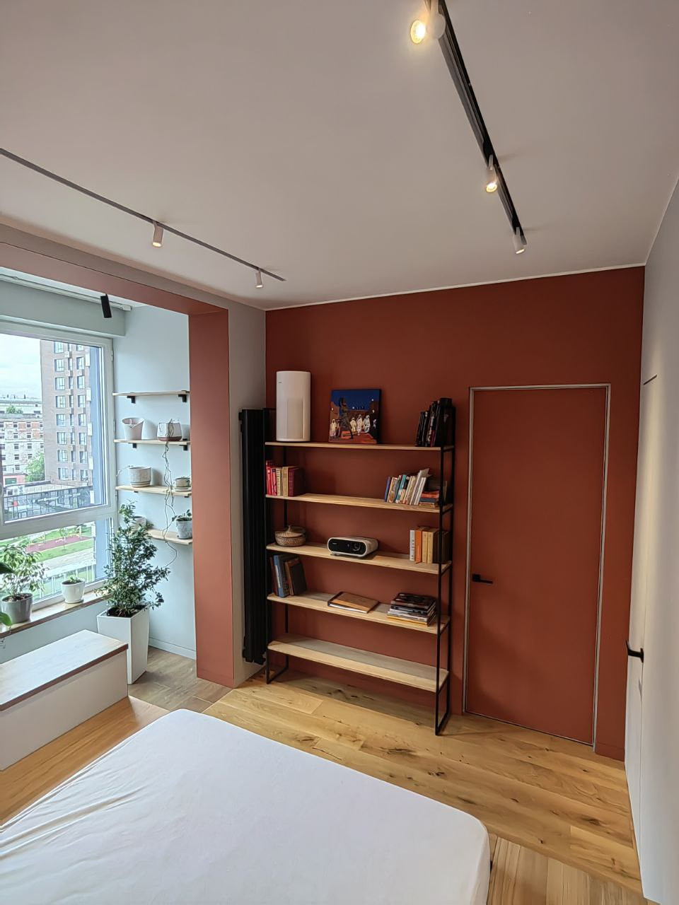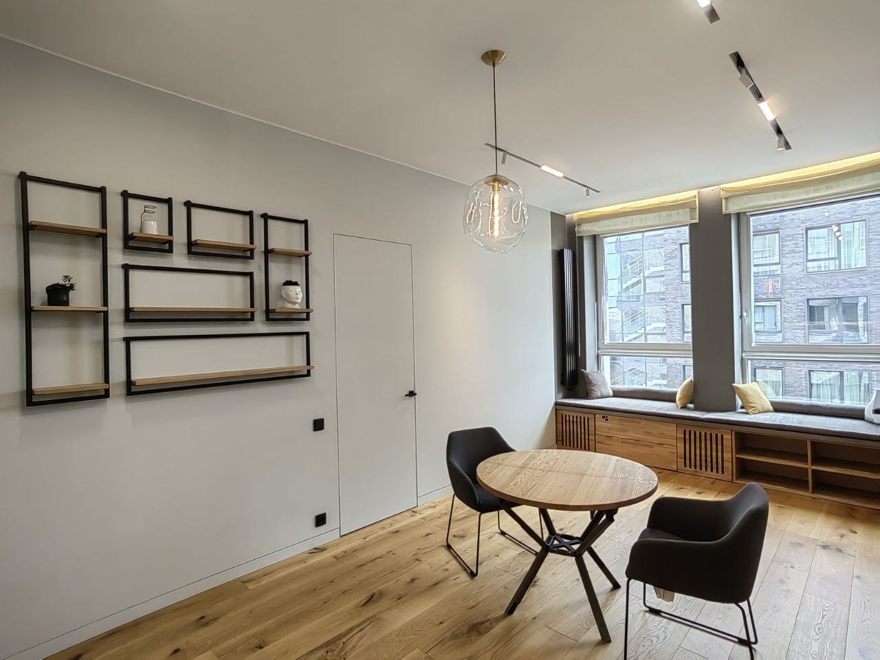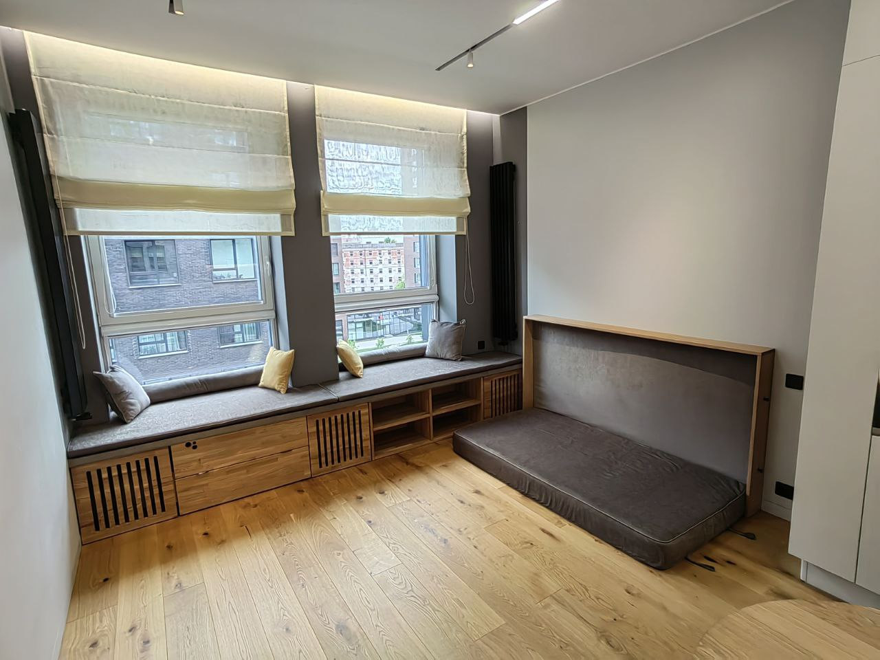 В кухне-гостиной скамья-подоконник со скрытым местом для проигрывателя винила и пластинок. Реализован проект скрытого раскладывающегося дивана, который сильно экономит пространство, противоположная стена используется для просмотра видео с проектора.