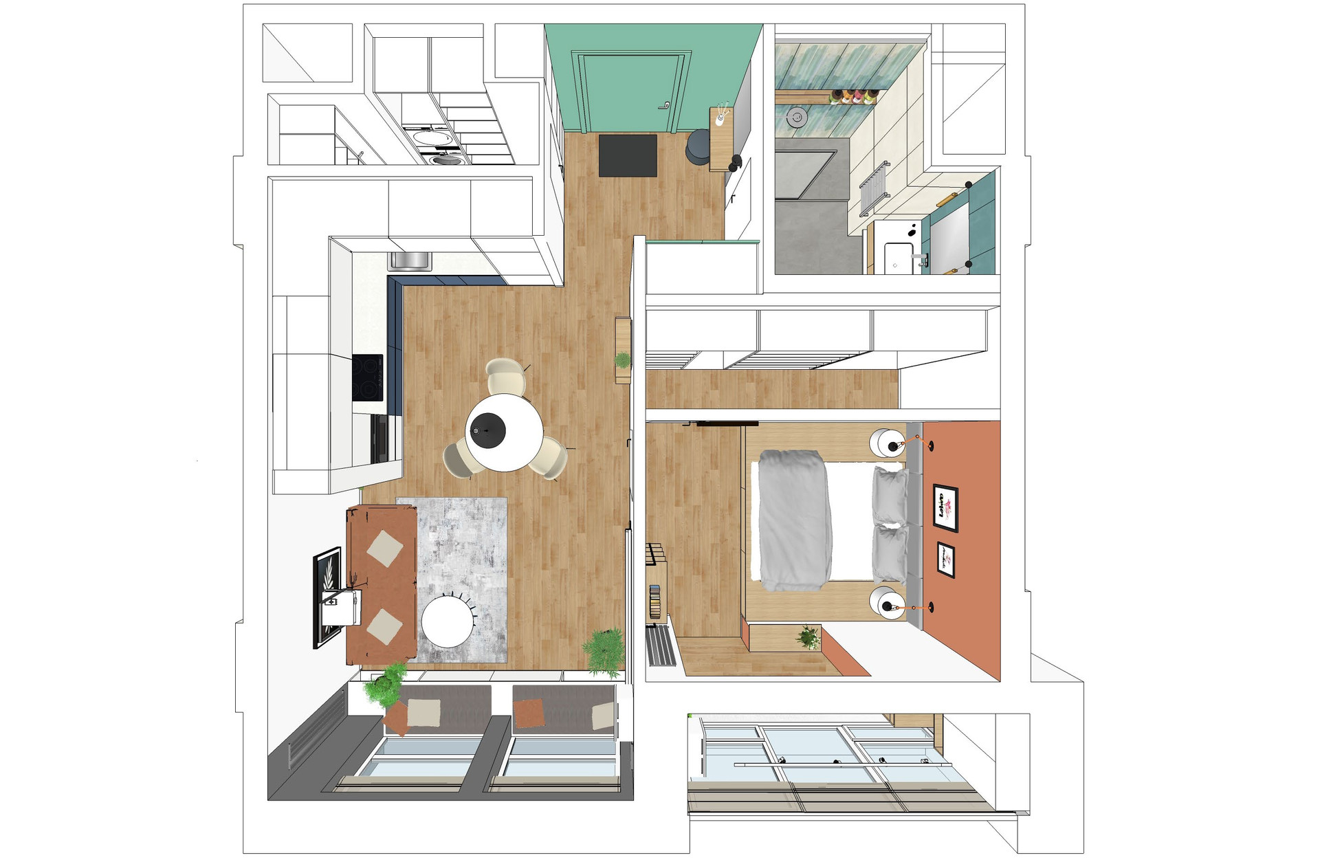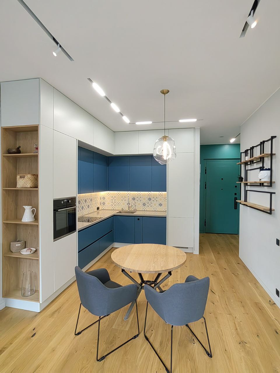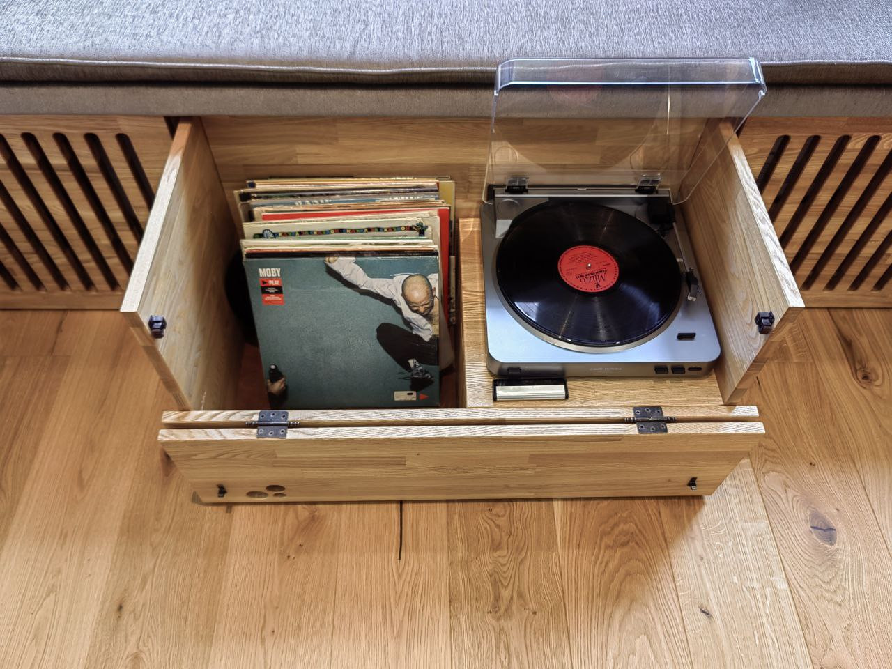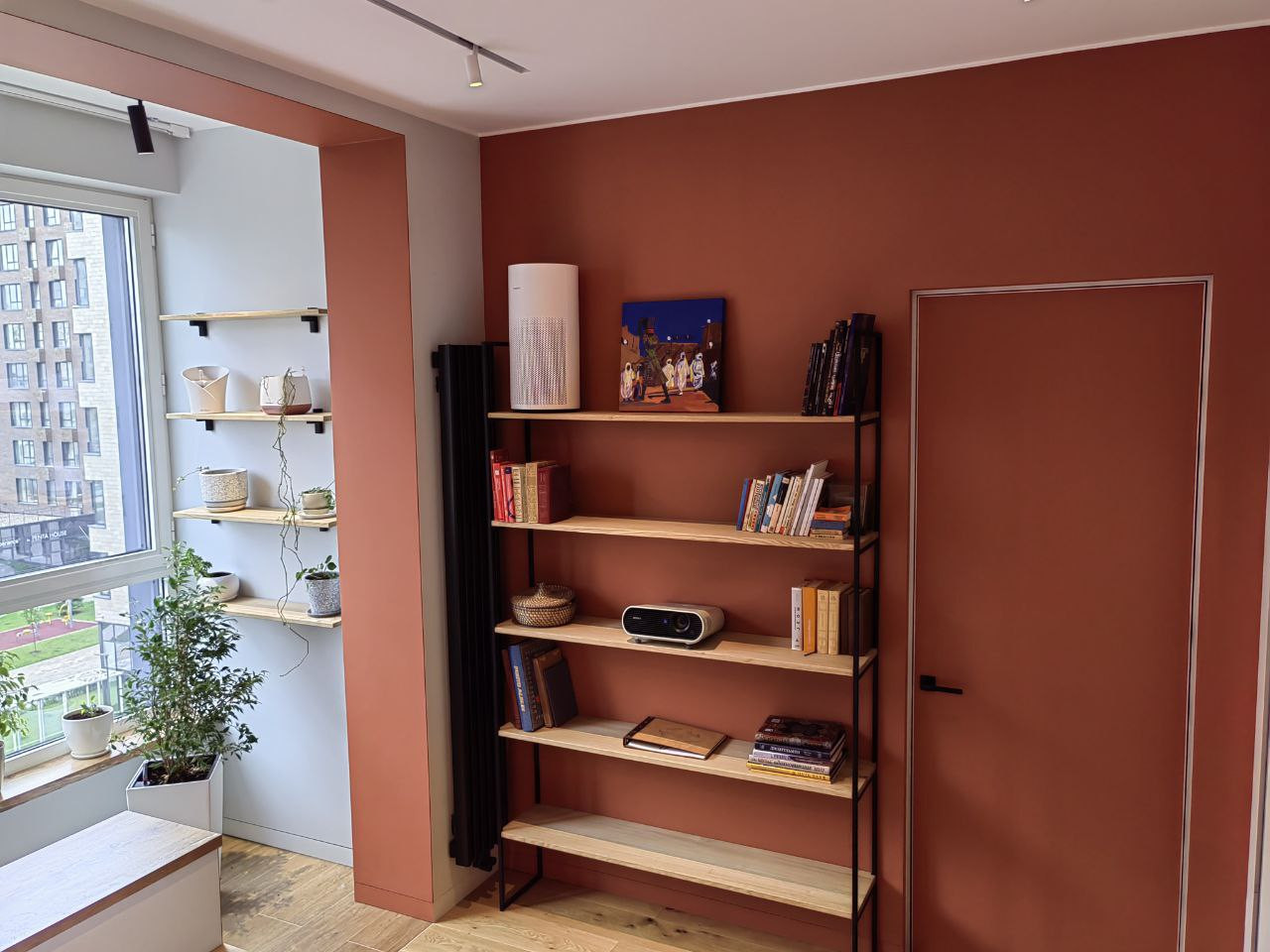 В кухне-гостиной скамья-подоконник со скрытым местом для проигрывателя винила и пластинок. Реализован проект скрытого раскладывающегося дивана, который сильно экономит пространство, противоположная стена используется для просмотра видео с проектора.
