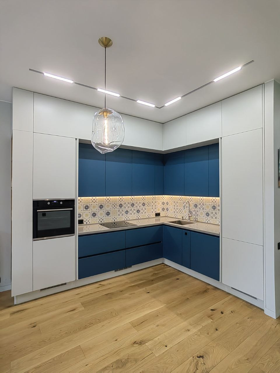 Кухня оборудована всей необходимой качественной бытовой техникой, холодильник встроенный однокамерный. Отдельная морозильная камера расположена в постирочной. посудомоечная машина, духовой шкаф, индукционная варочная поверхность.