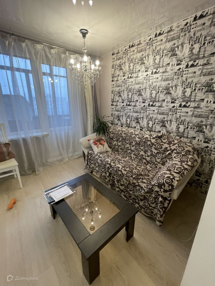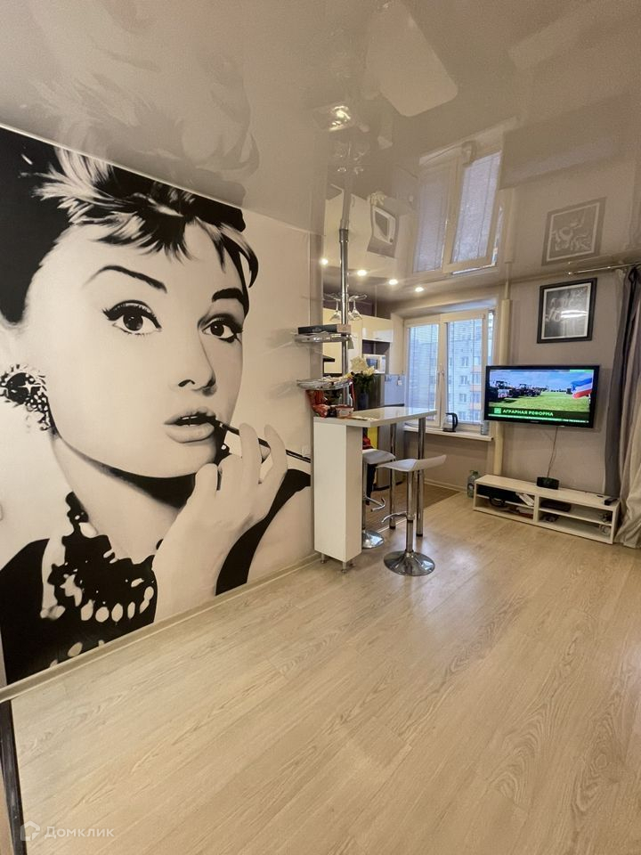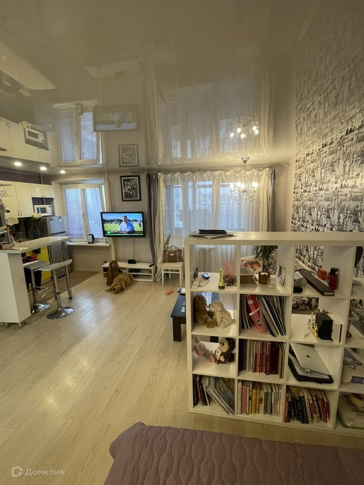 Квартира расположена на 8 этаже. Естественное освещение изобилует комнату благодаря большим окнам, которые также делают комнату светлой и просторной.