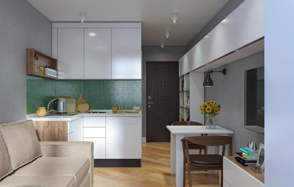 На фото предлагаемый пример дизайна для такой планировки .
