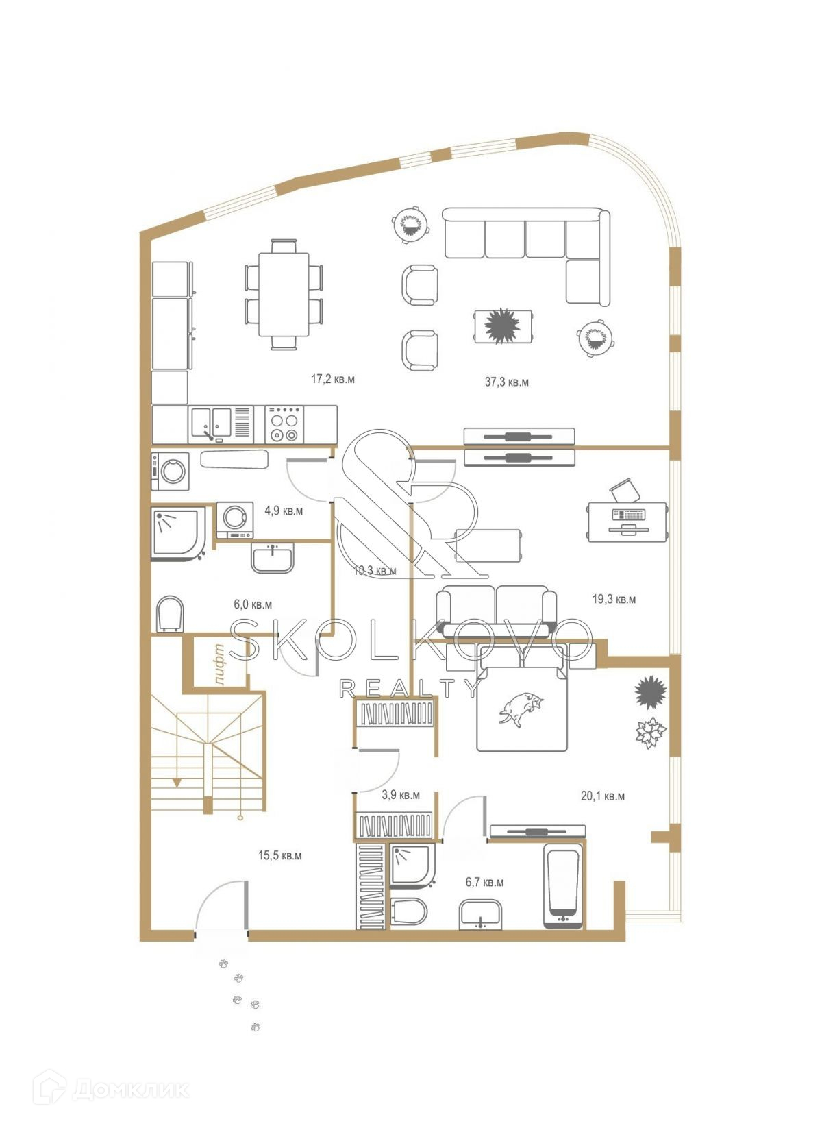 В пентхаусе выполнена отделка дорогими натуральными материалами. За покупателем останутся приятные хлопоты по меблировке и выбору декора.