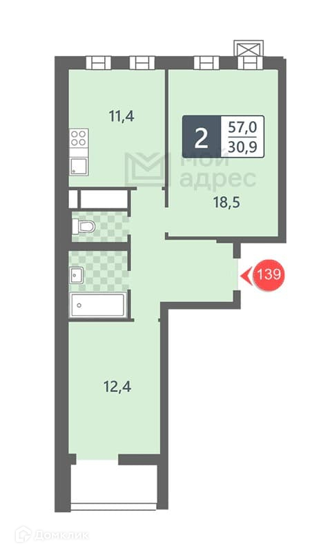 Общая площадь 57 м2