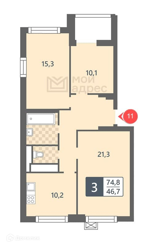 Общая площадь 74.8 м2