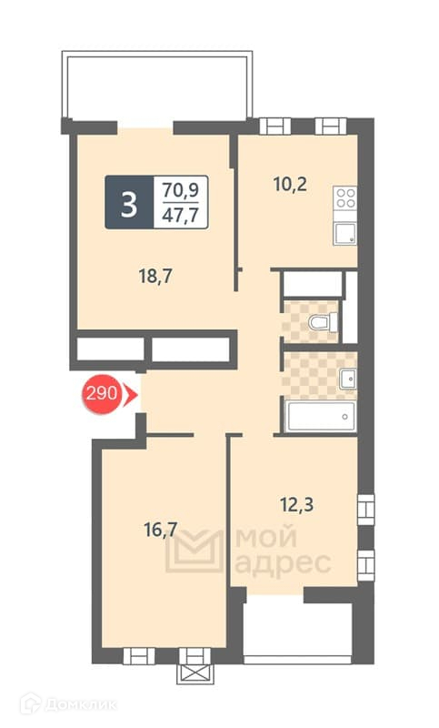 Общая площадь 70.9 м2