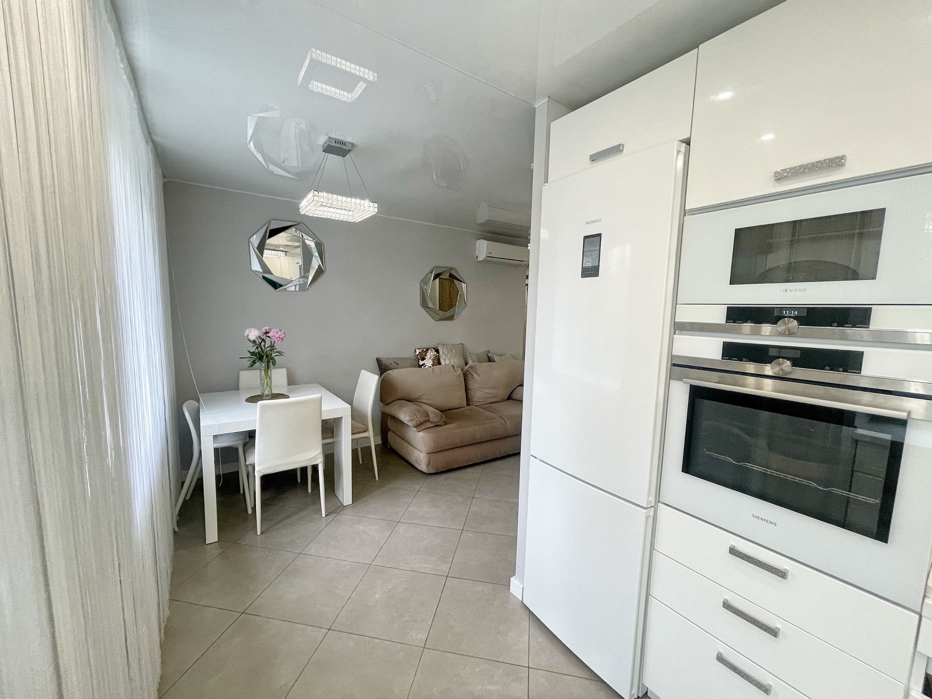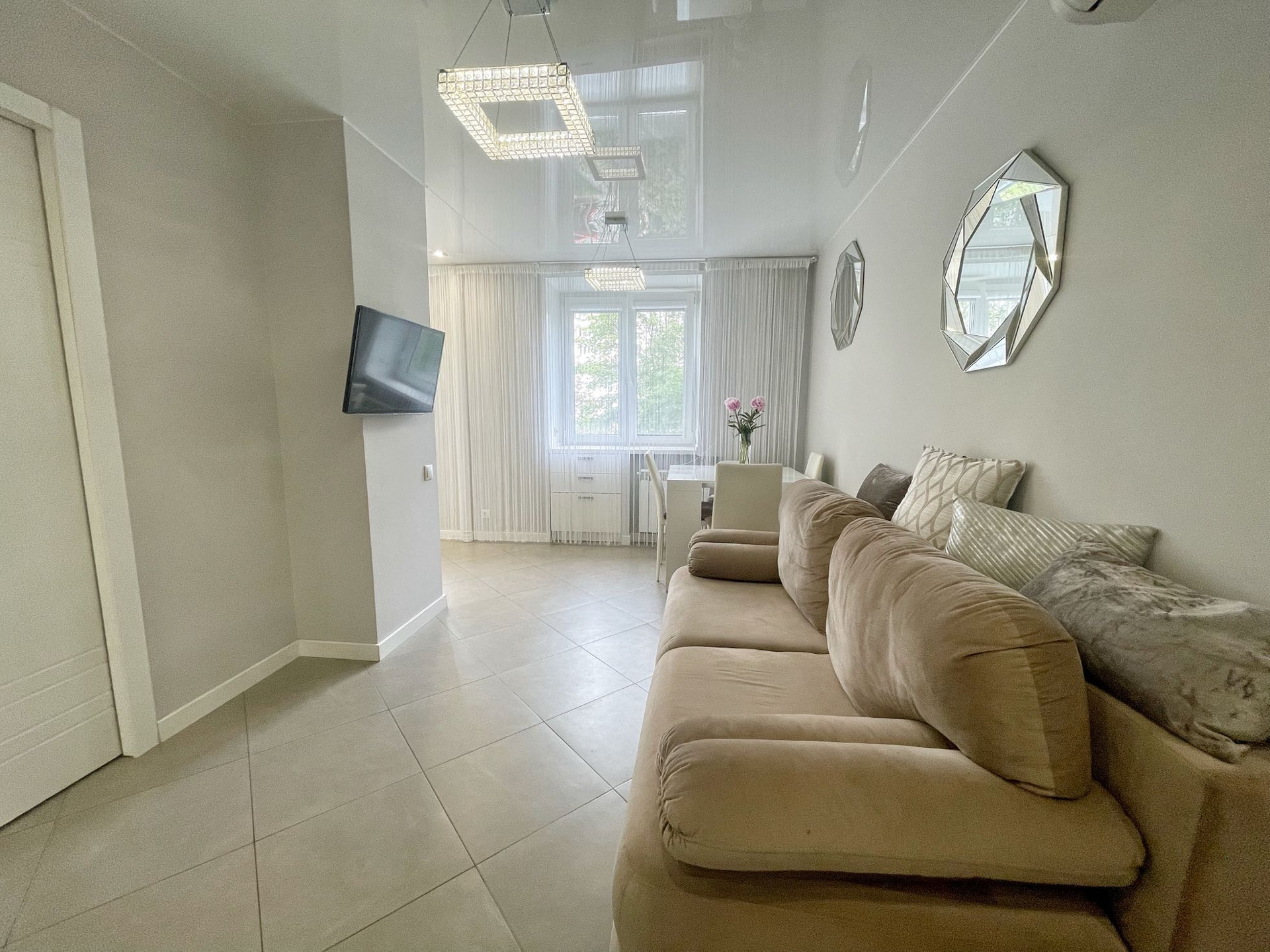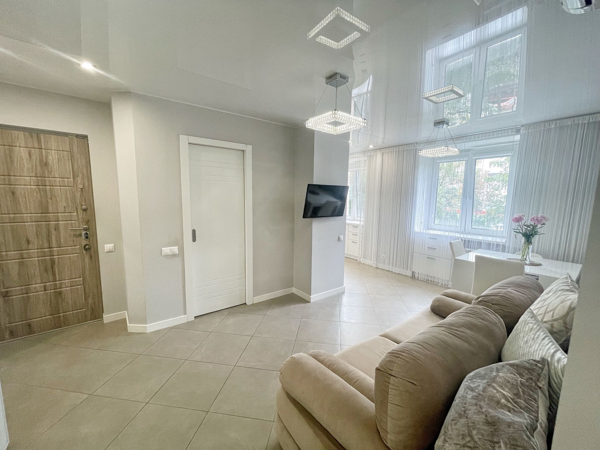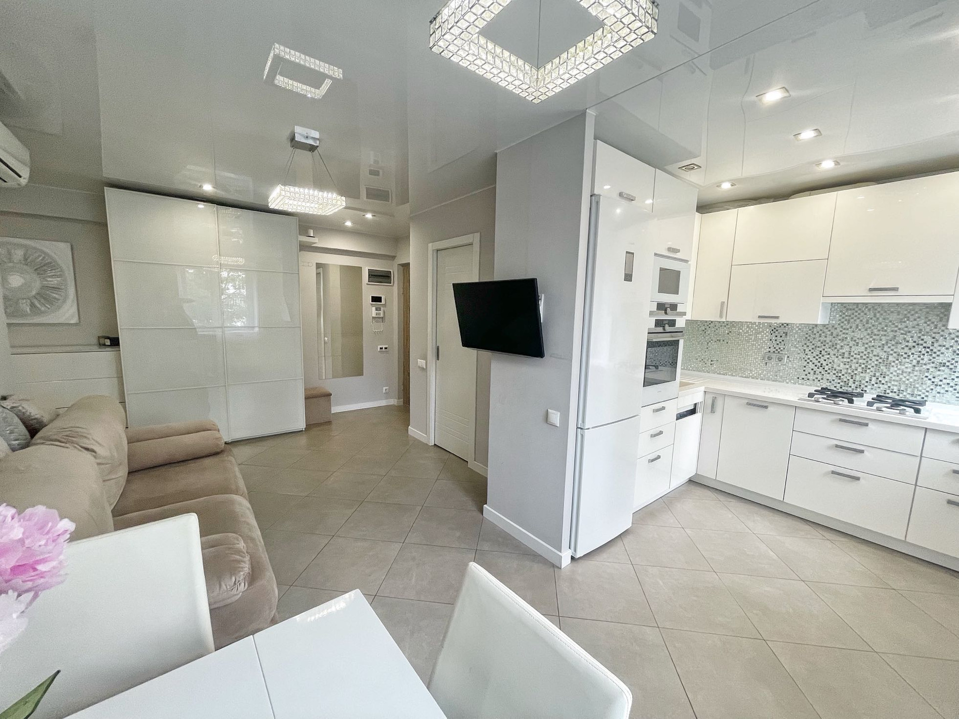 В квартире выполнен качественный дизайнерский ремонт в современном стиле.Выделена отдельно гардеробная комната, разведены теплые полы в коридоре и кухне-гостиной, установлено видео наблюдение. В комнате сделано панорамное балконное остекление. Квартира распашного типа, выходит на обе стороны дома.