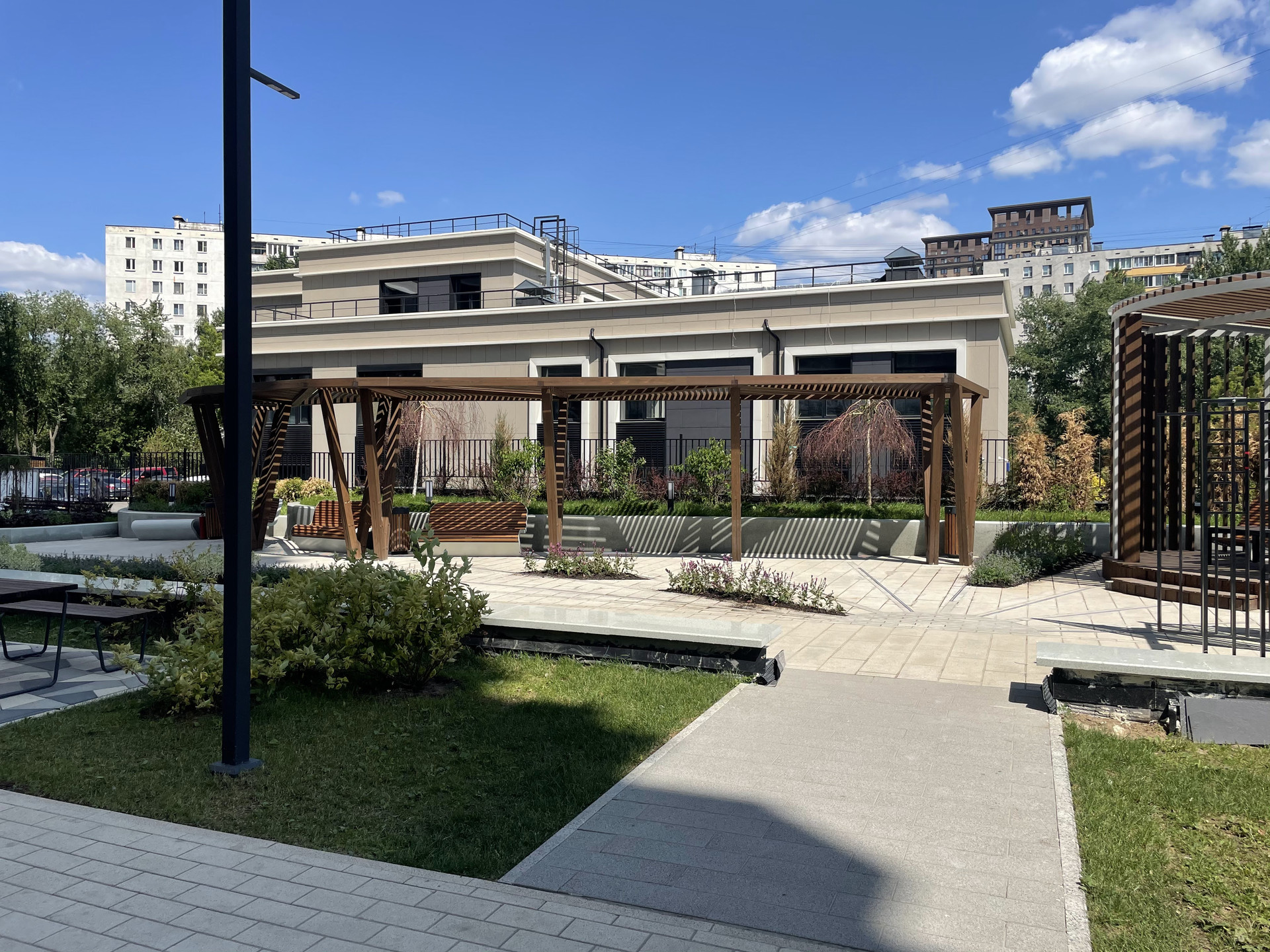 Дворы домов закрыты и от машин, и от посторонних — попасть на территорию смогут только жильцы. Уютные дворы созданы для отдыха: детские комплексы, спортивные площадки, столы для настольного тенниса и свое поле с трибуной для зрителей.