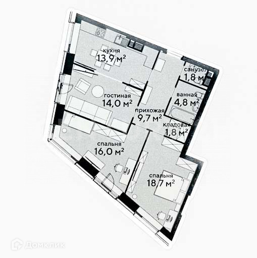Жилая площадь 48.7 м2
