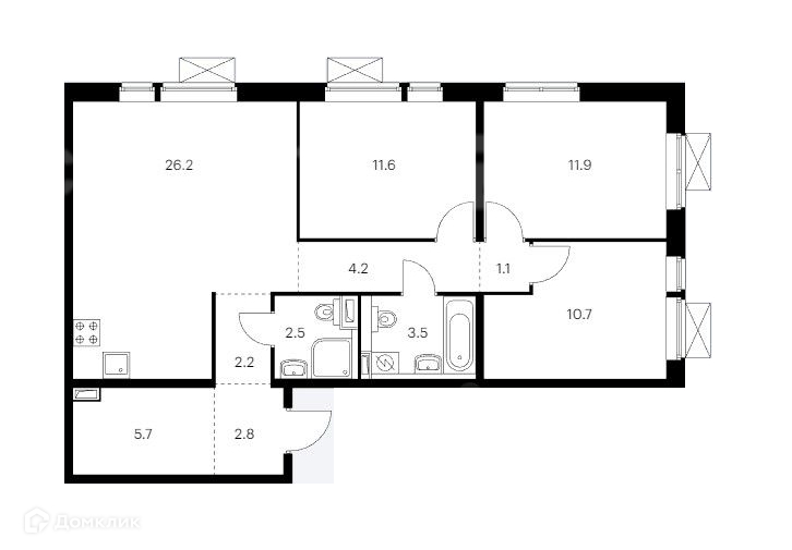 -Общая площадь - 82.4 м². Кухня - 26.2 м². Комнаты - 11.6, 11.9, 10.7 м²;