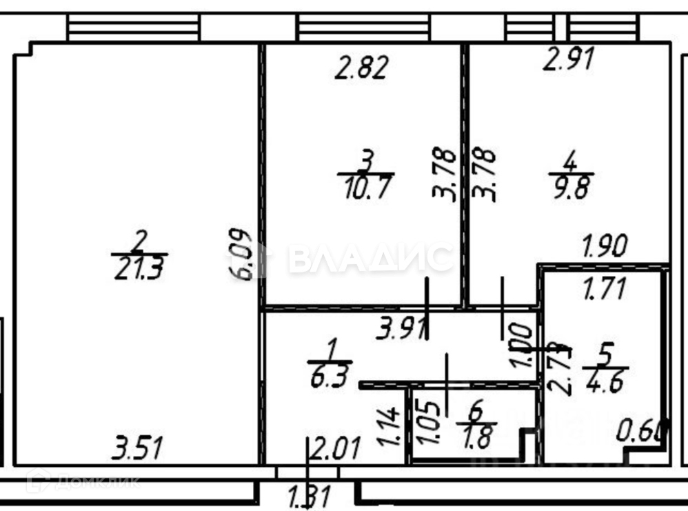 2 изолированные комнаты 10,7 м. и 9,8м. , 1 совмещенная комната с кухней 21,3 м.