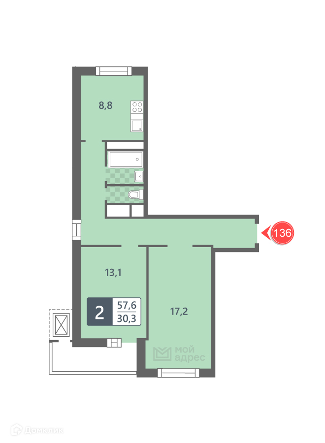 Общая площадь 57.6 м2