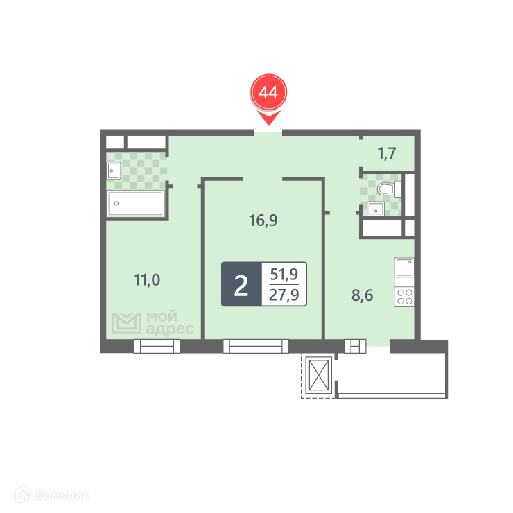 Общая площадь 51.9 м2