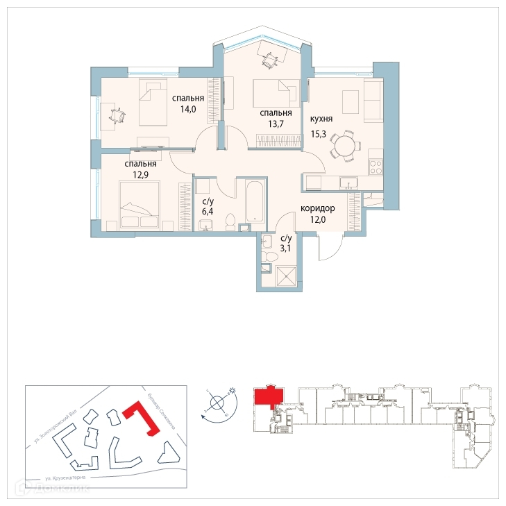 3-комнатная квартира, 77.4 м2, этаж 2 / 27, на продажу в Москве, улица Золоторожский Вал, 11с20
