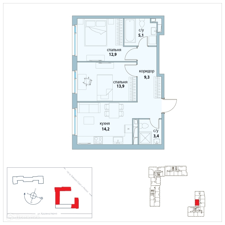 2-комнатная квартира, 58.8 м2, этаж 5 / 25, на продажу в Москве, улица Крузенштерна