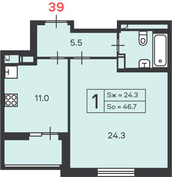 Квартира расположена на 9-ом этаже, общая площадь 46,7 кв.м. комната 24,3  кв.м,  кухня 11,0 кв.м., санузел совмещен, выход на балкон из кухонной комнаты . Состояние - без отделки, первый этаж в доме, нежилой. Подземная парковка.
