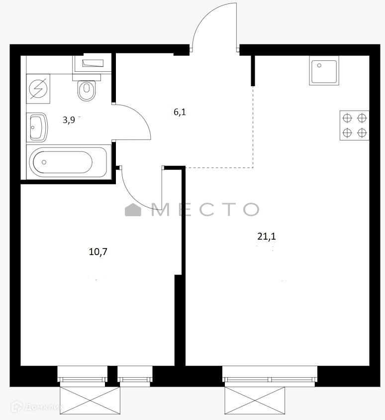В квартире изолированная спальня 11 м2, большая кухня-гостиная 21 м2 которая, благодаря своему размеру, позволит гармонично расположиться зоне приготовления пищи, столовой зоне и зоне отдыха. Также просторный сан.узел 4м2, в котором уже все предусмотрено для подключения стиральной машины.