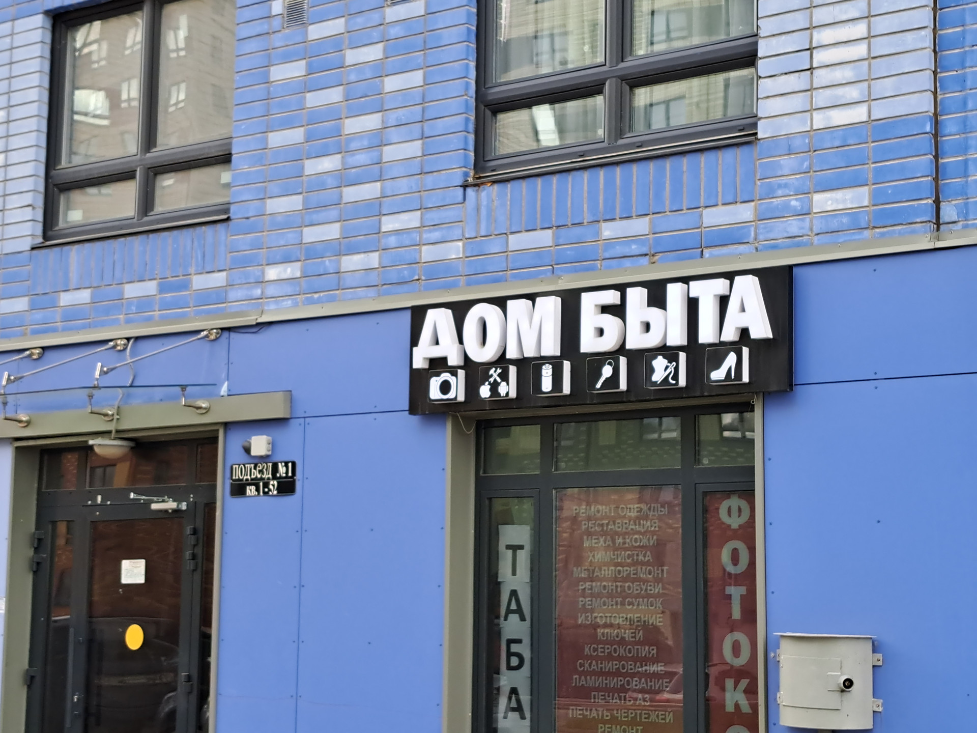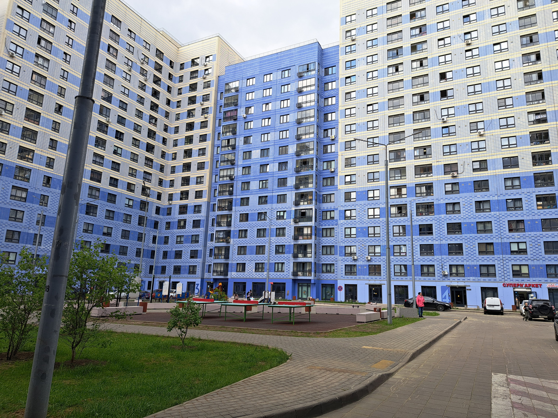 В этом доме есть магазин.Во дворе детская и спортивная площадка.