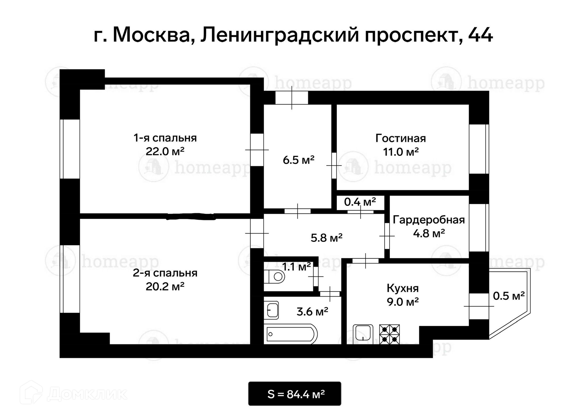 3-комнатная квартира, 84.4 м2, этаж 6 / 6, на продажу в Москве, Ленинградский проспект, 44