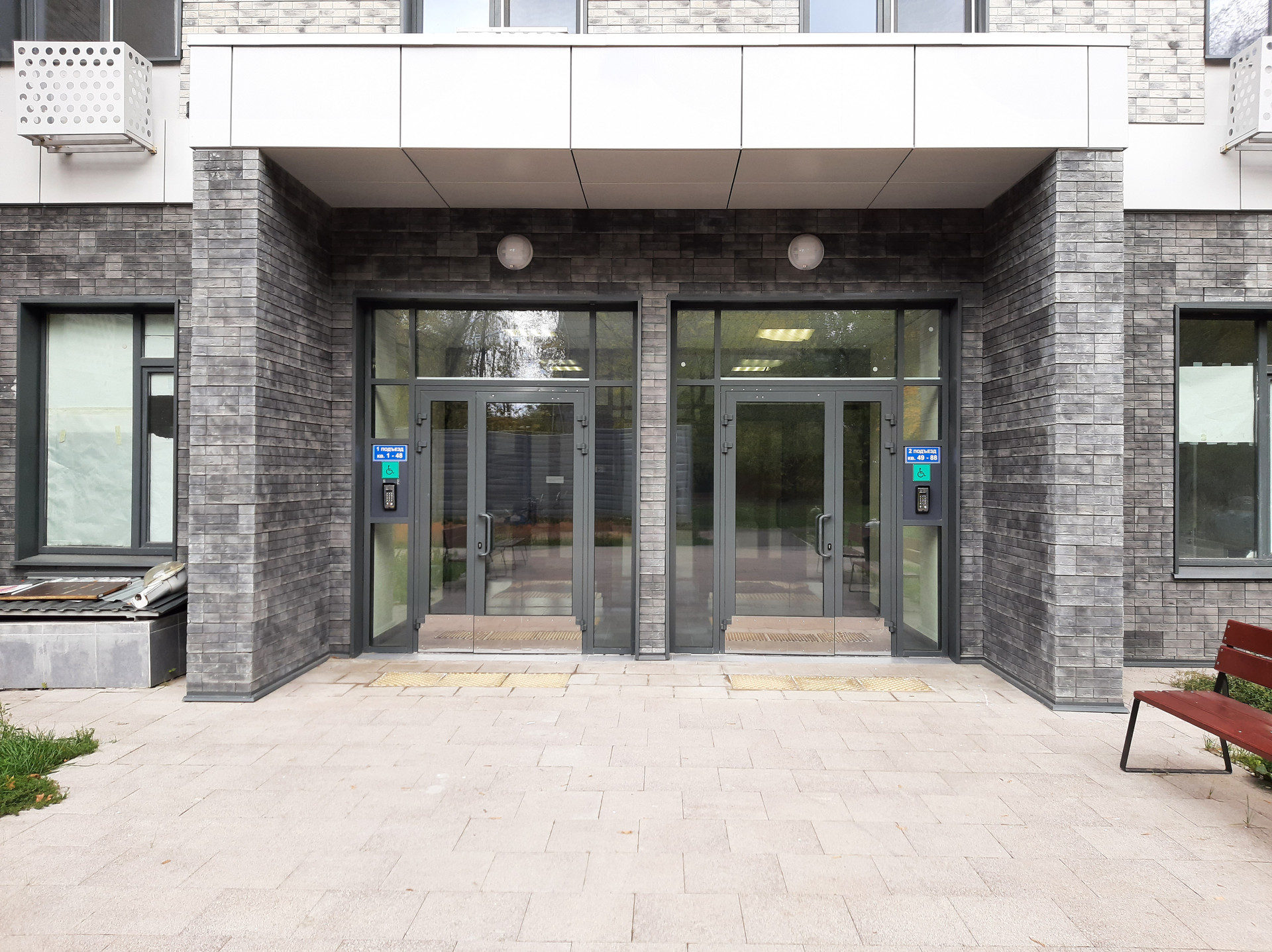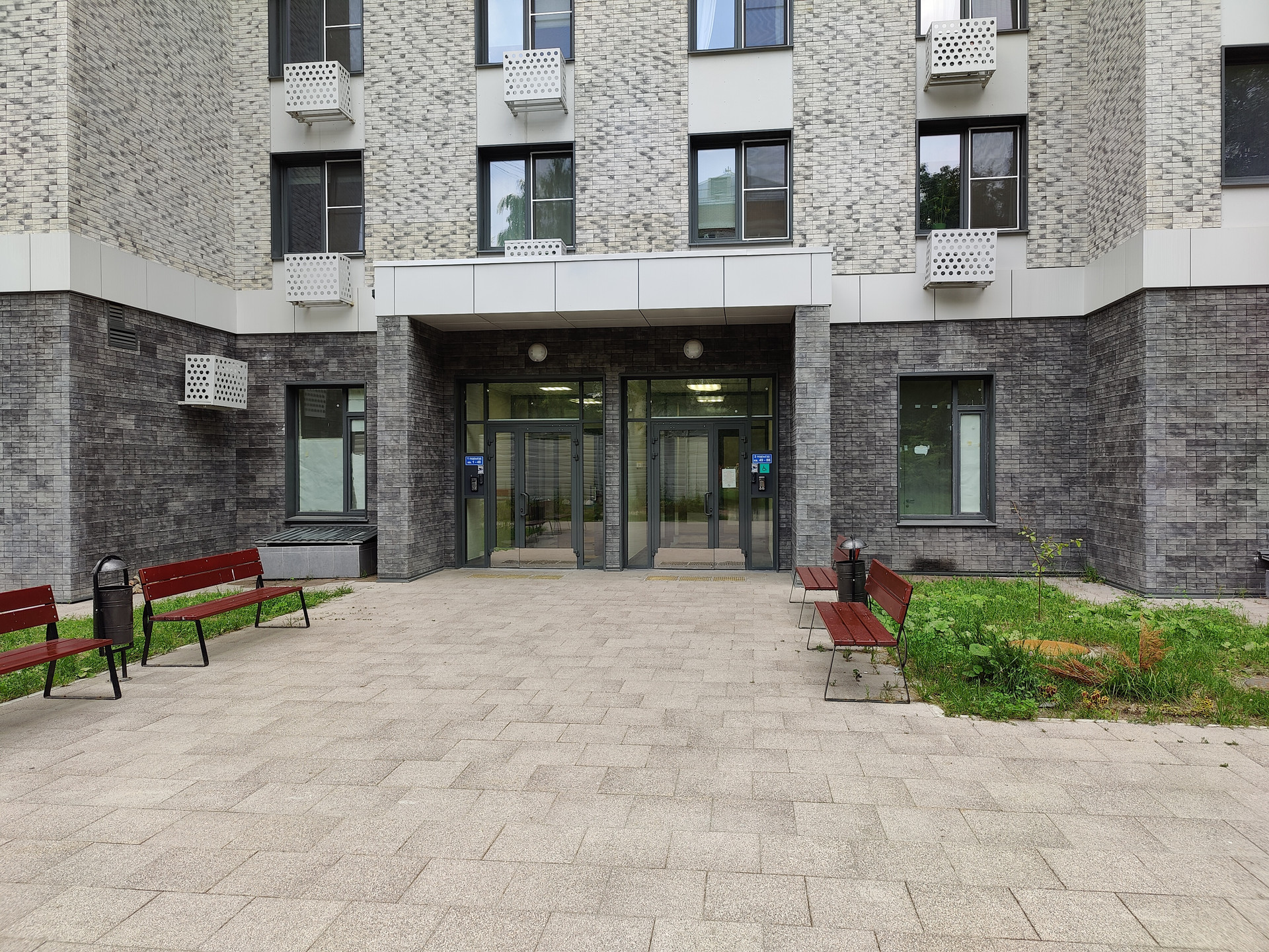 Первый этаж облицован керамогранитными панелями темно-серого цвета и оформлен витражным остеклением.