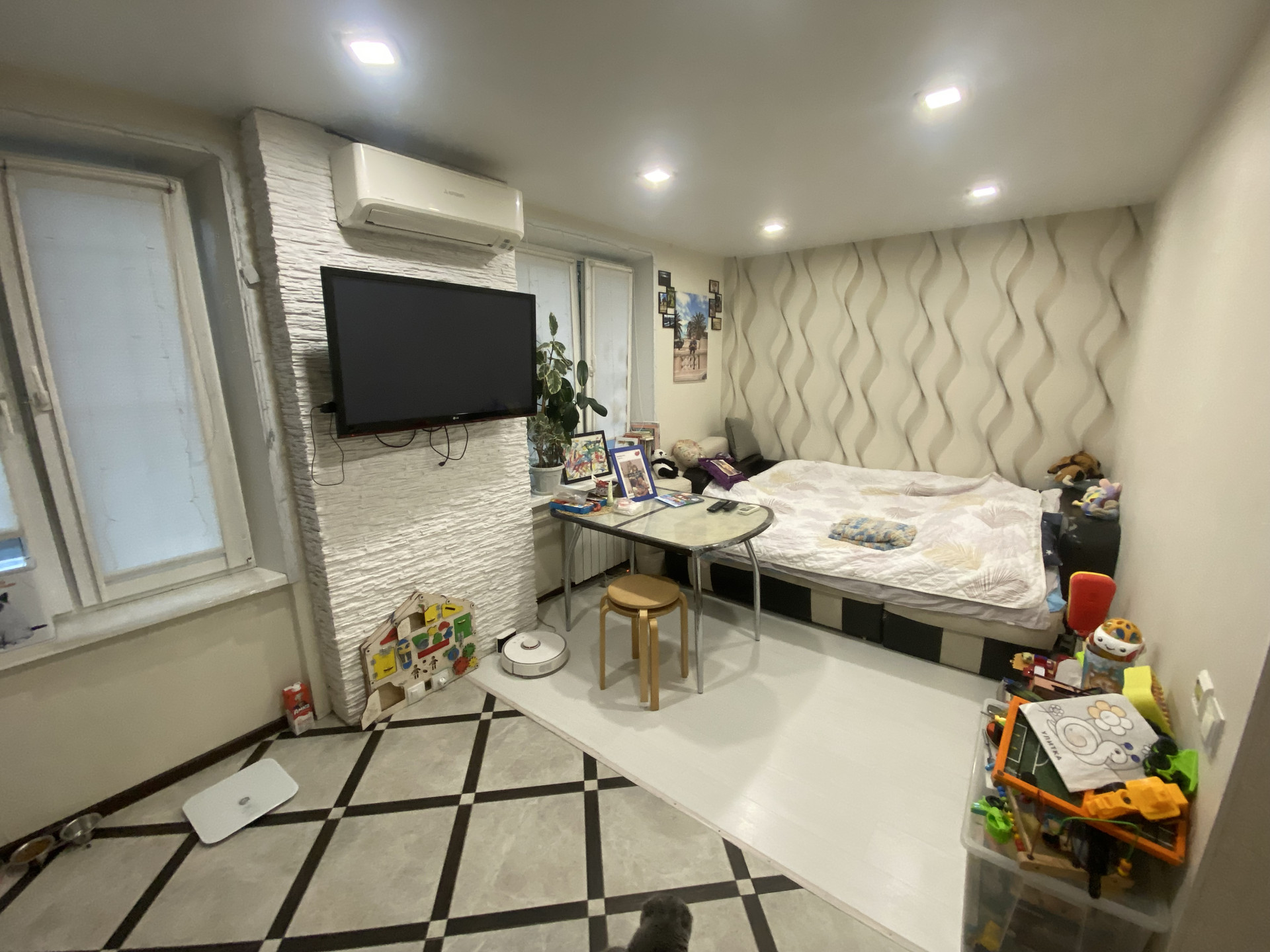 Теплый пол везде где плитка. В квартире установлены пластиковые окна.