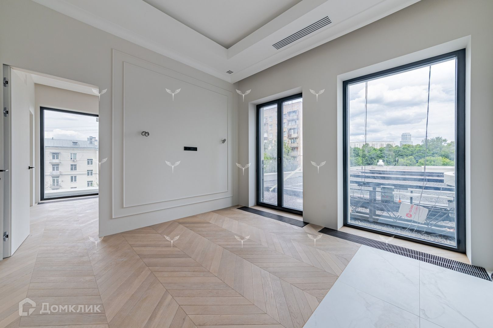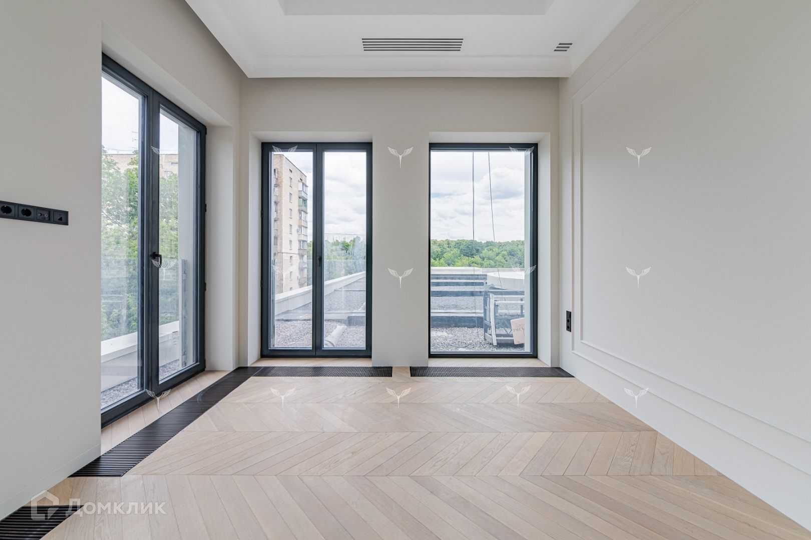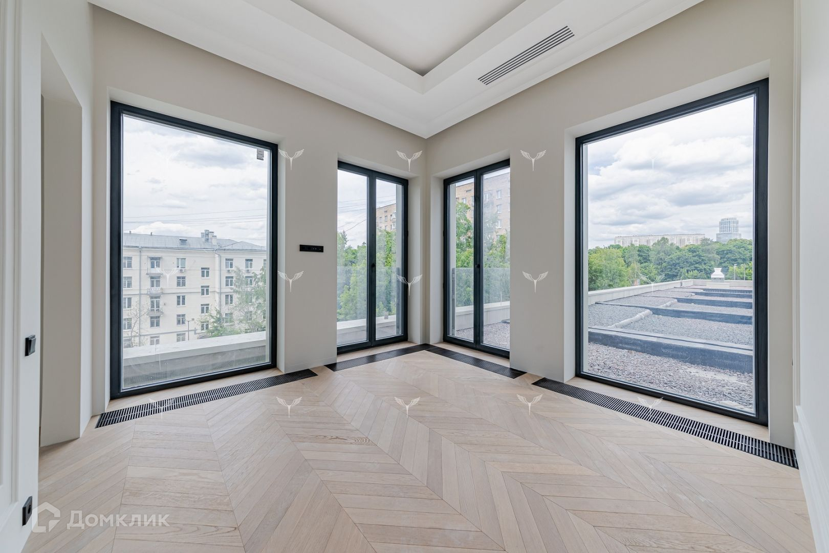 В квартире 7 великолепных окон 2.8 метра высотой с возможностью открывания , дерево-алюминиевый профиль