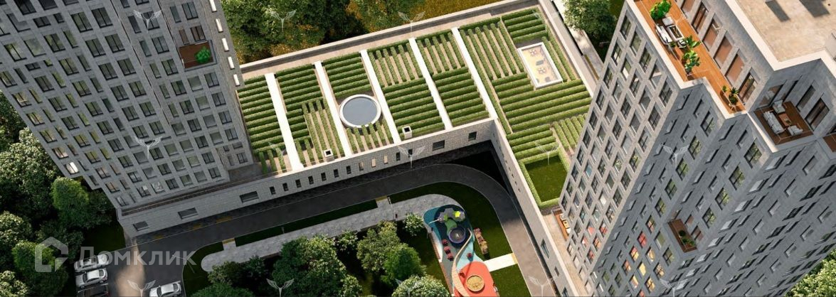 Окна квартиры смотрят на ландшафтный зеленый лабиринт.