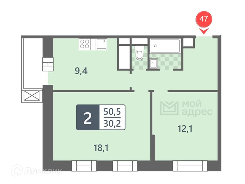 Общая площадь 50.5 м2