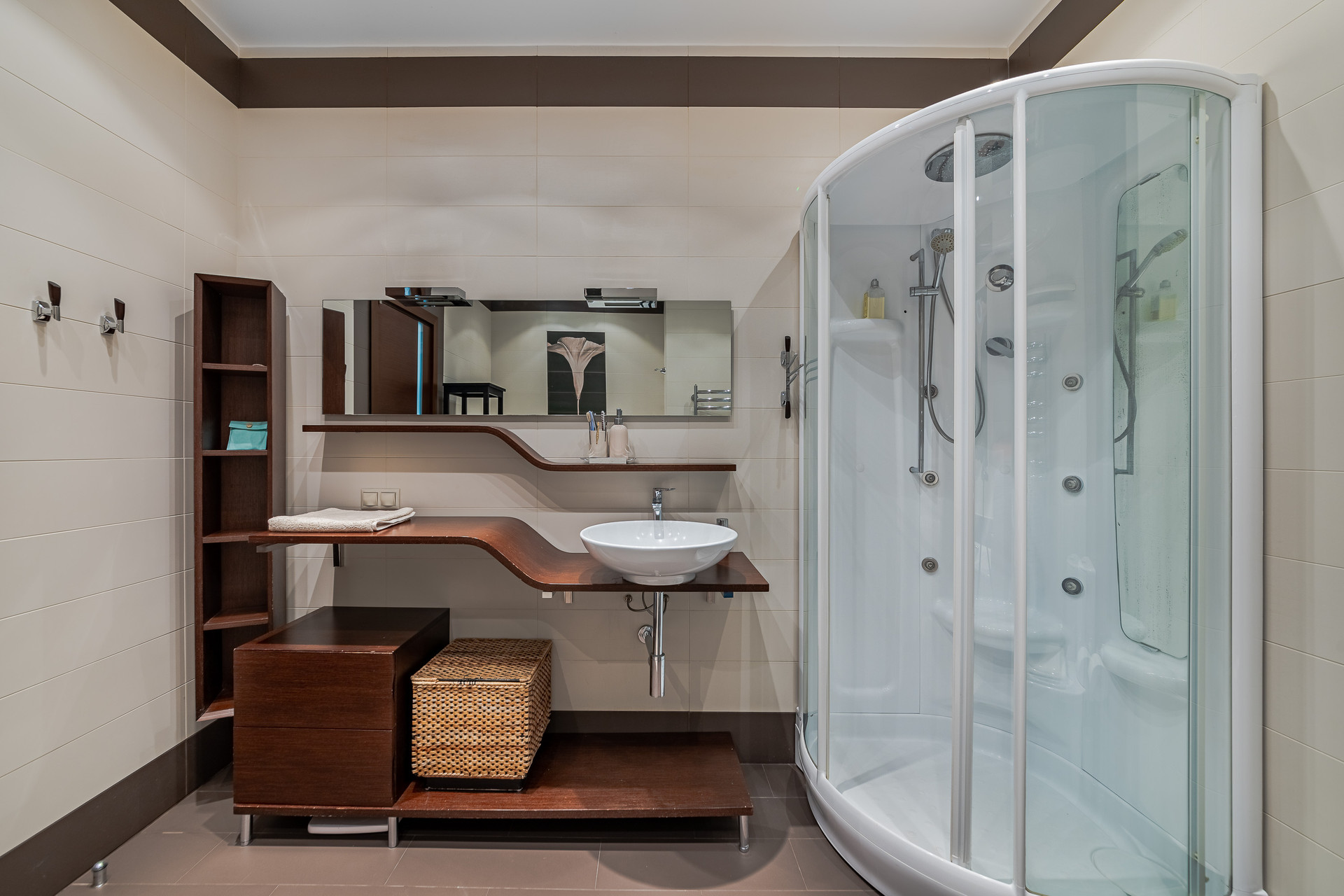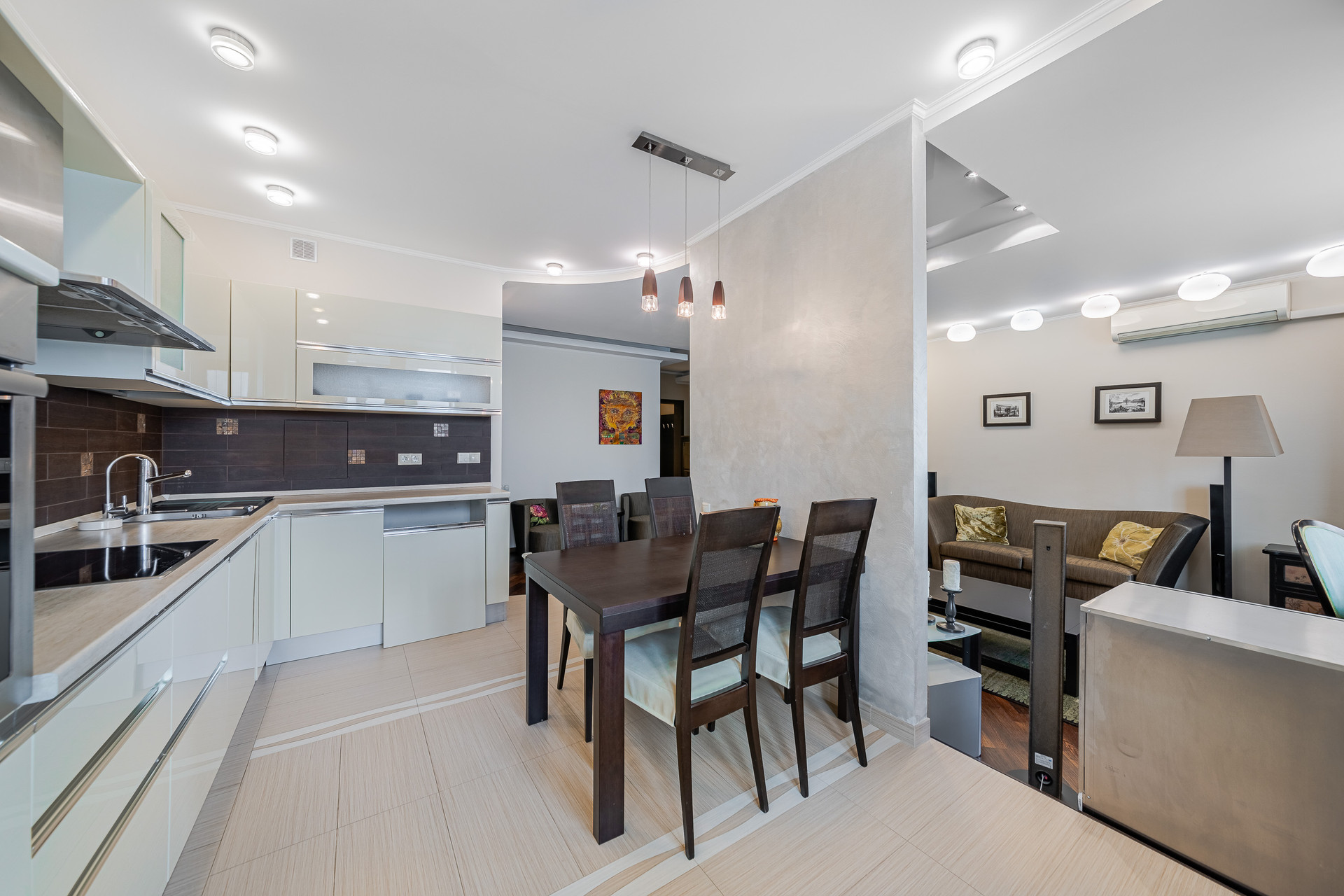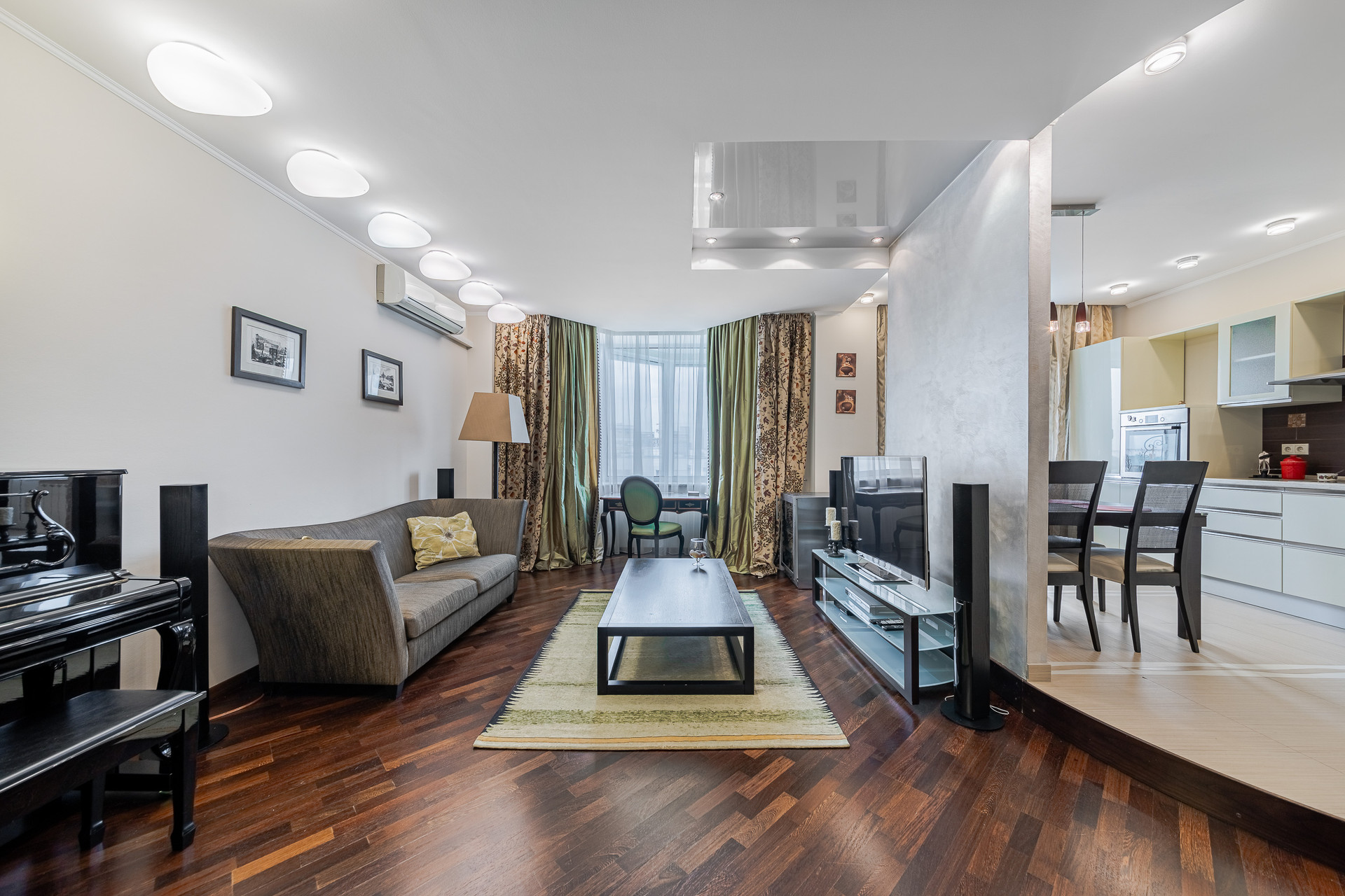 Функциональное планировочное решение: холл, просторная оборудованная лоджия с зоной отдыха, большая кухня - гостиная, детская и спальня, две гардеробные. Санузел совмещен, установлены душевая кабина и ванная, есть бойлер и система водоочистки. Предусмотрена система кондиционирования и теплый пол на кухне и в санузле. Мебель в спальне и детской, и телевизор по договоренности. Помещения выполнены в мягких оттенках, что позволило создать особую атмосферу уюта.