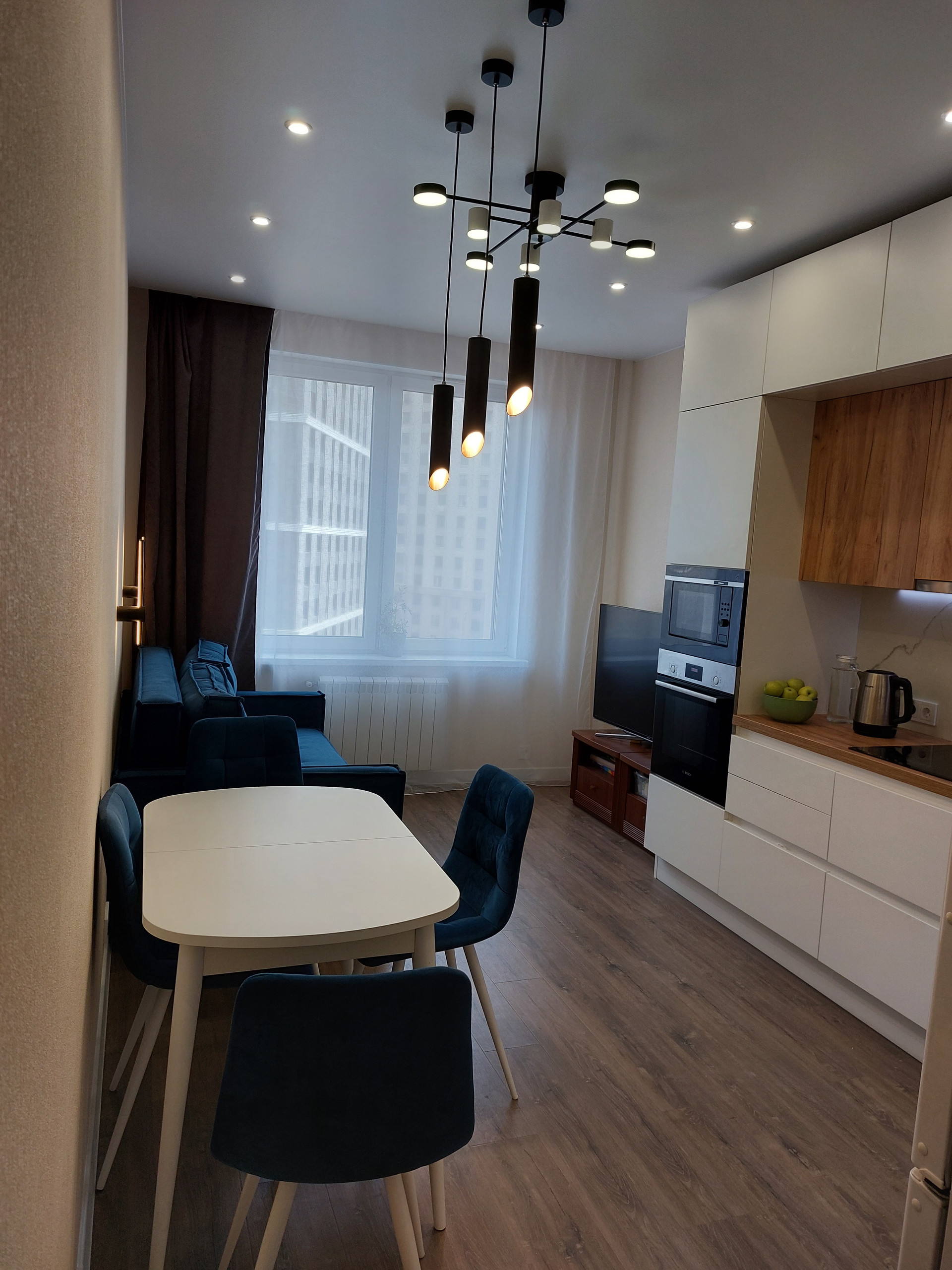 Просторная кухня-гостиная 17 кв. м., три изолированные комнаты по 15 кв. м., 2 сан узла и 2 балкона. В квартире выполнен качественный ремонт на основе дизайн-проекта с грамотным зонированием: большая гардеробная система, огромный встроенный шкаф в прихожей, кухня Мария со встроенной техникой (индукционная плита +духовка+ микроволновка +посудомойка), в каждой комнате выведены розетки под TV и интернет.