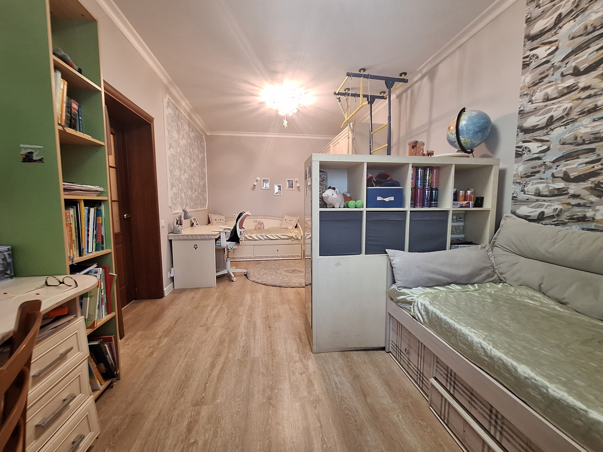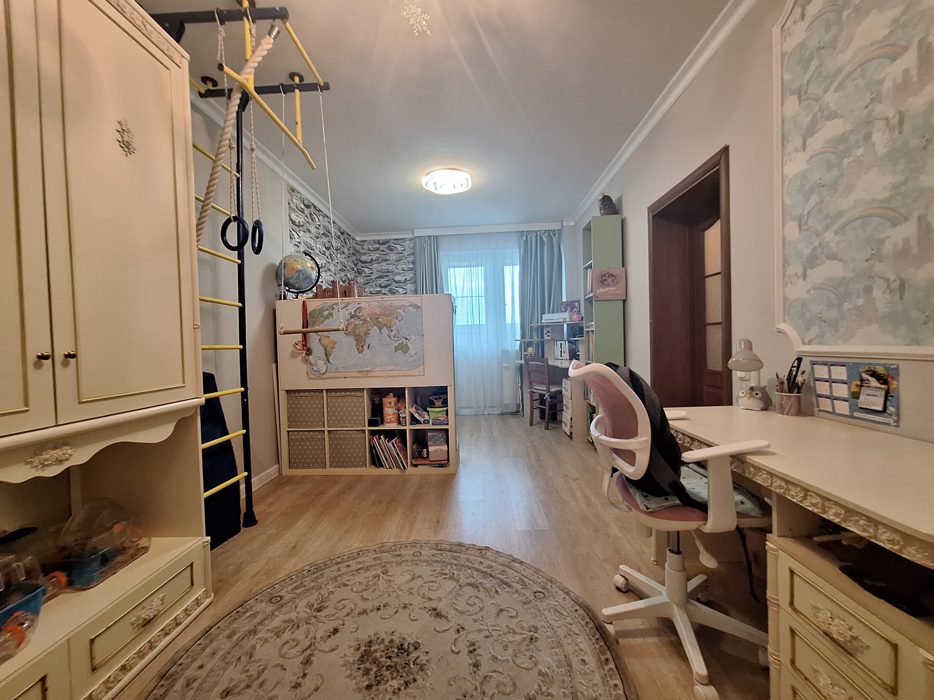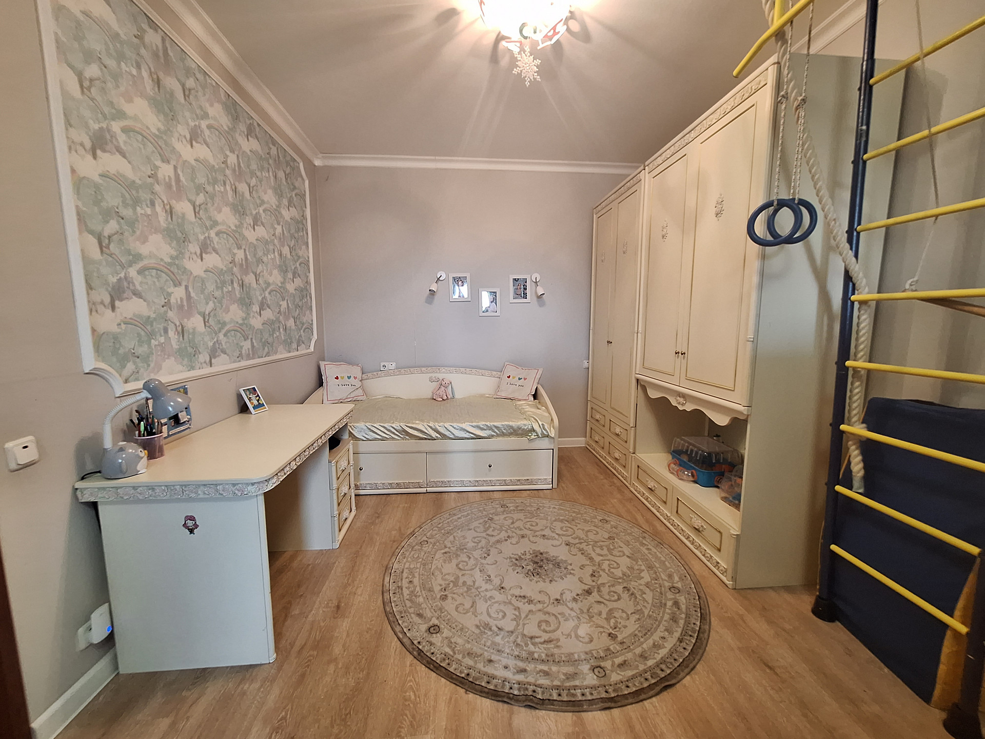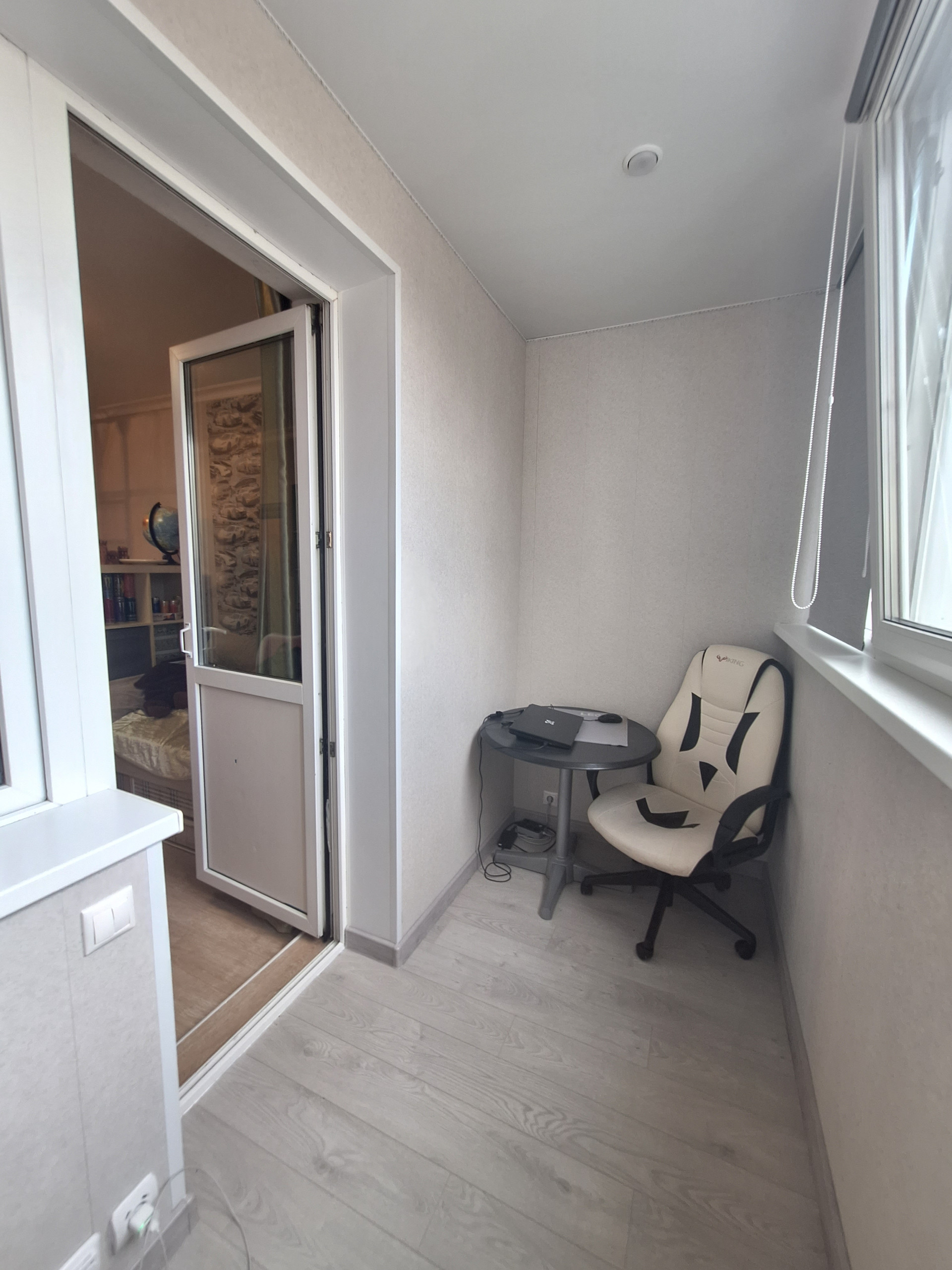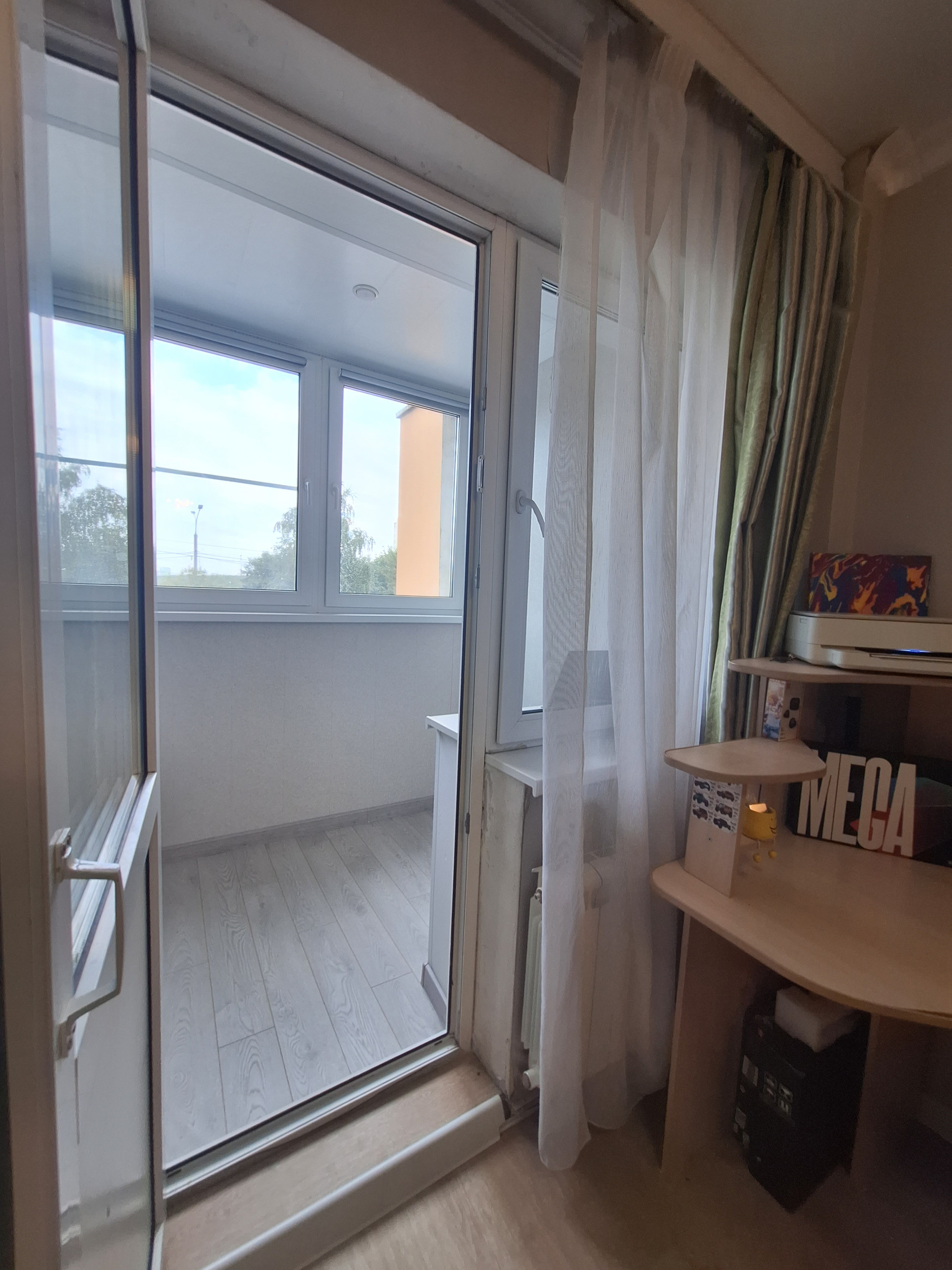 Спальня-детская (19.6 м2) с выходом на большую утепленную, остекленную лоджию -2.2 м2 (новые окна, теплый пол, вывод розеток и освещения). Возможно организовать рабочую зону/кабинет.