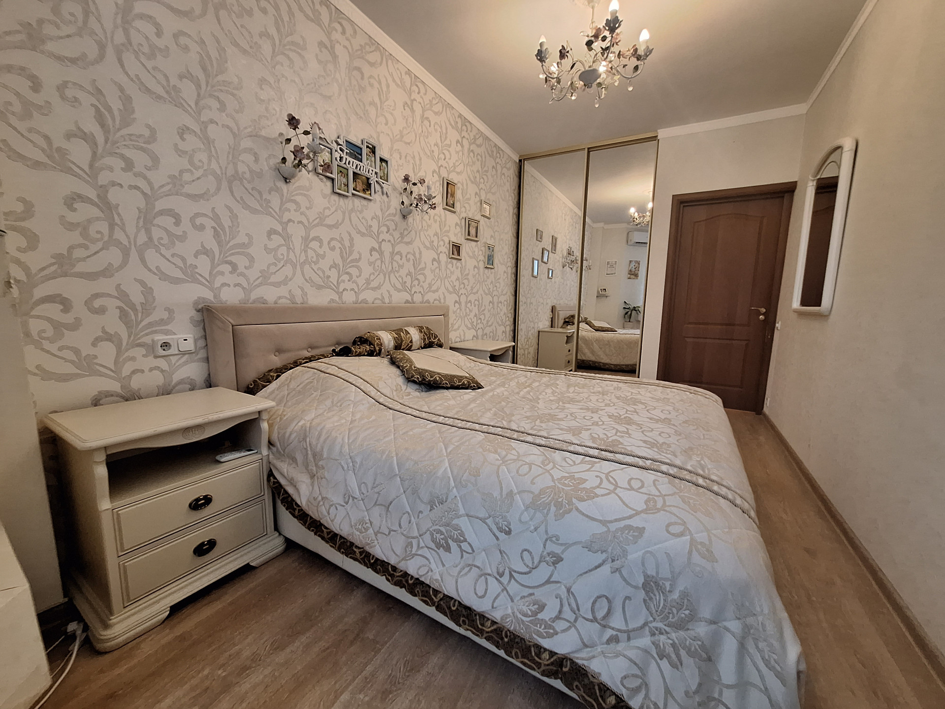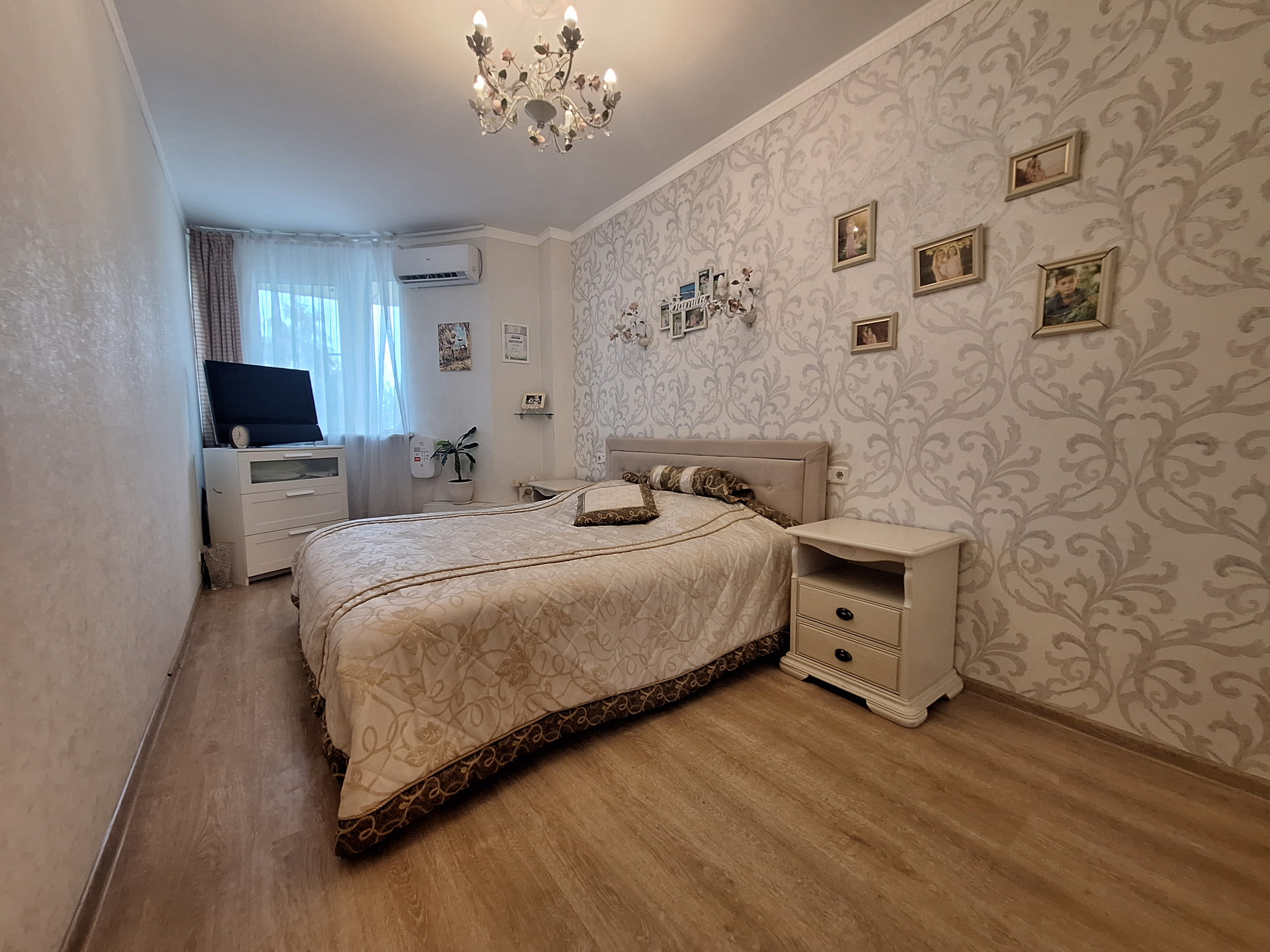 Комфортная спальня (14.5 м2) с вместительным встроенным шкафом. Для комфорта установлен кондиционер, бризер- всегда свежий воздух нужной температуры.