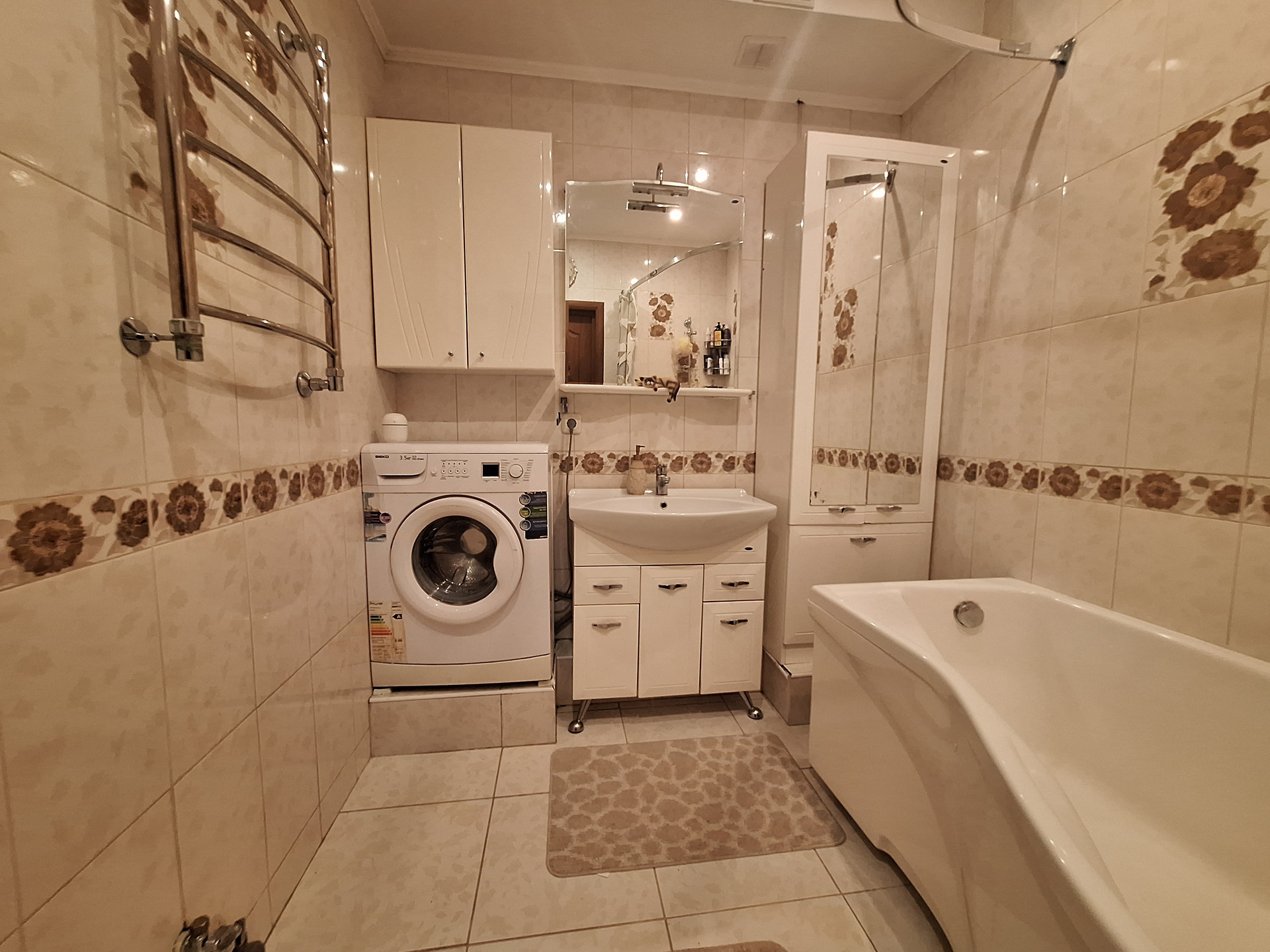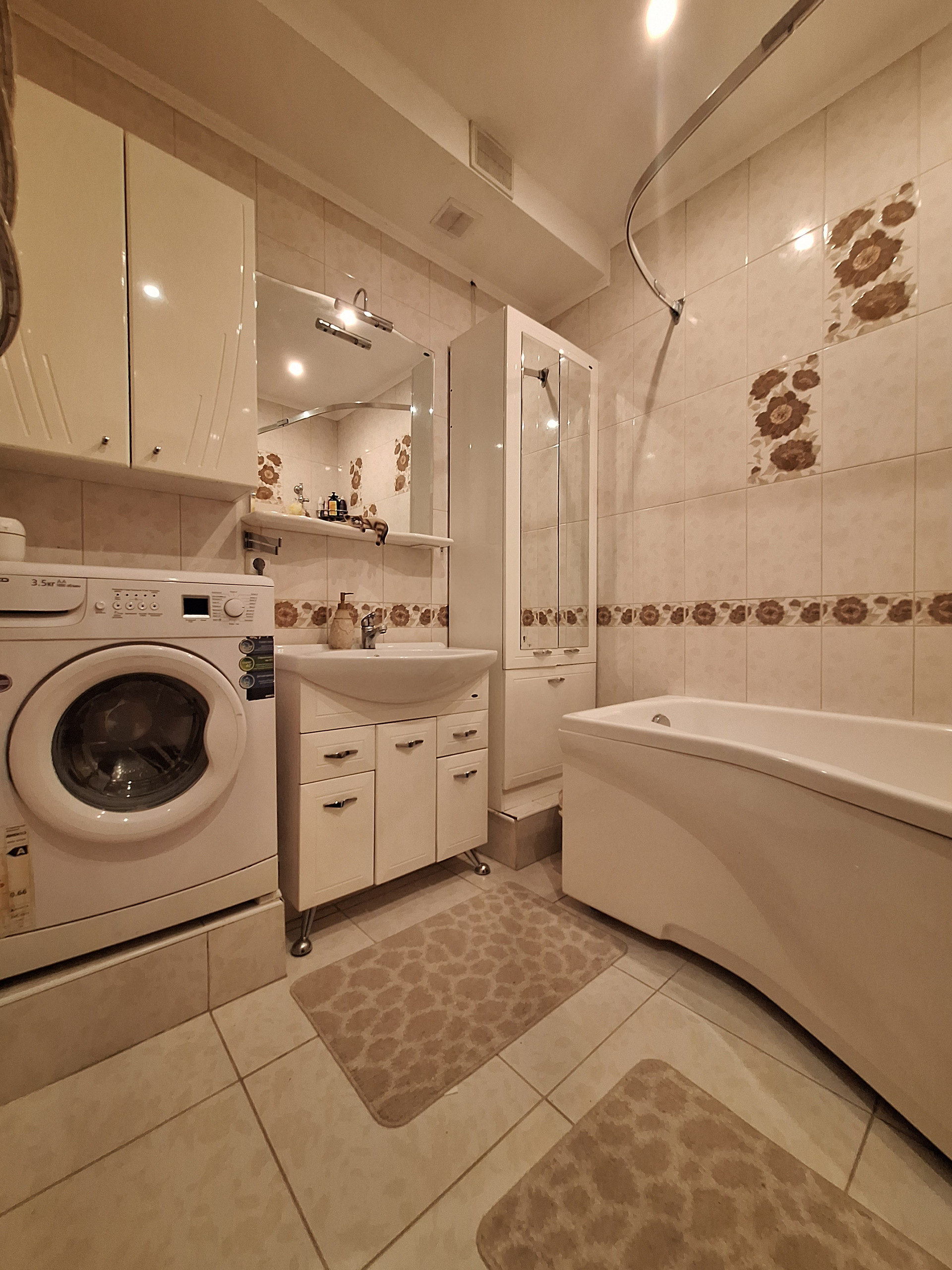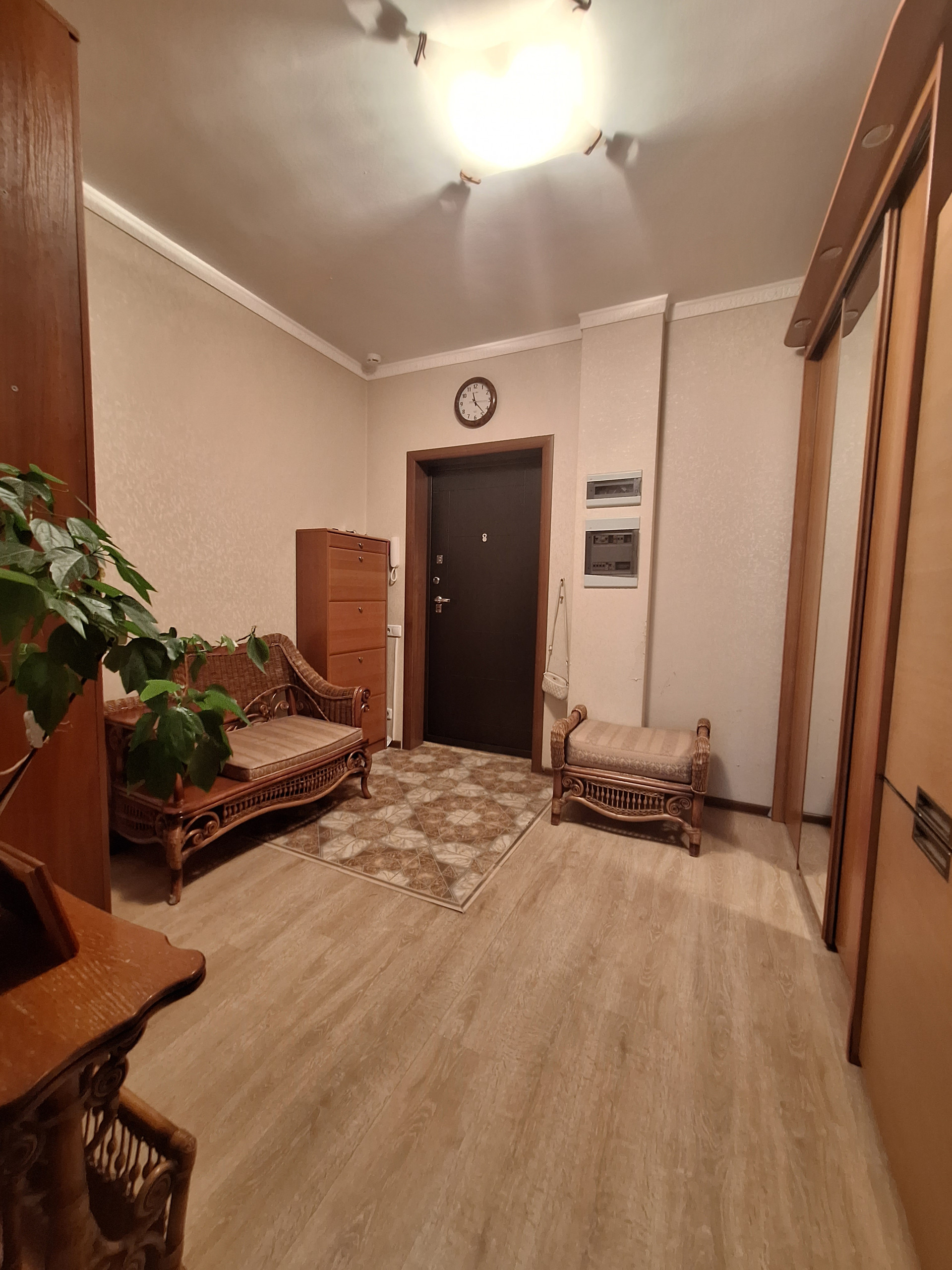 Высокие потолки. Очень тихая квартира, соседей вообще не слышно. В доме консьерж.