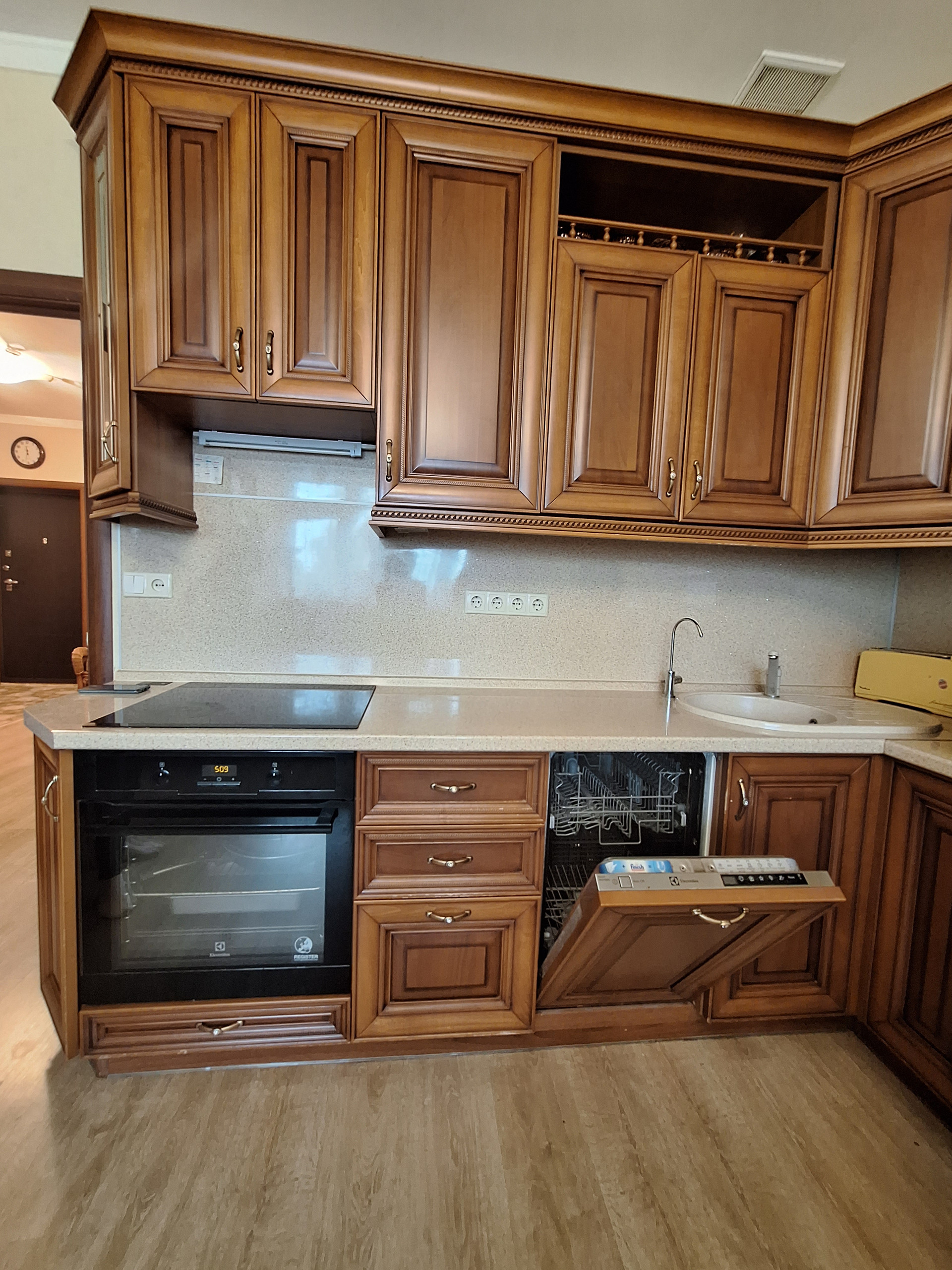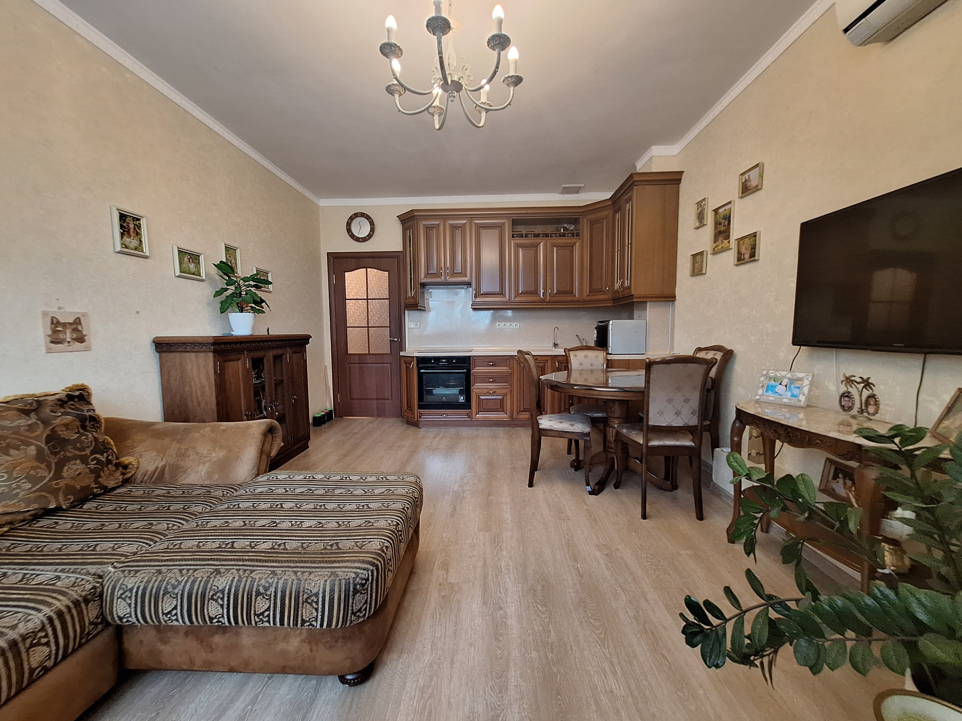 Кухня-гостиная (18 м2) с эркерным окном (встроенная кухня- массив дерева, встроенная бытовая техника), кондиционер.