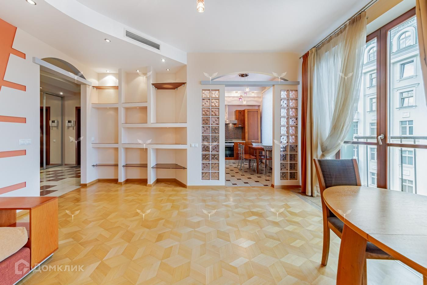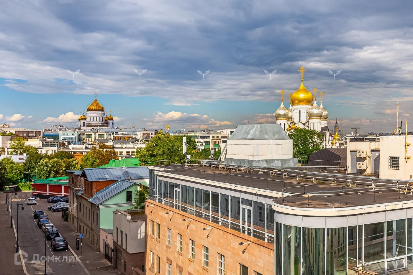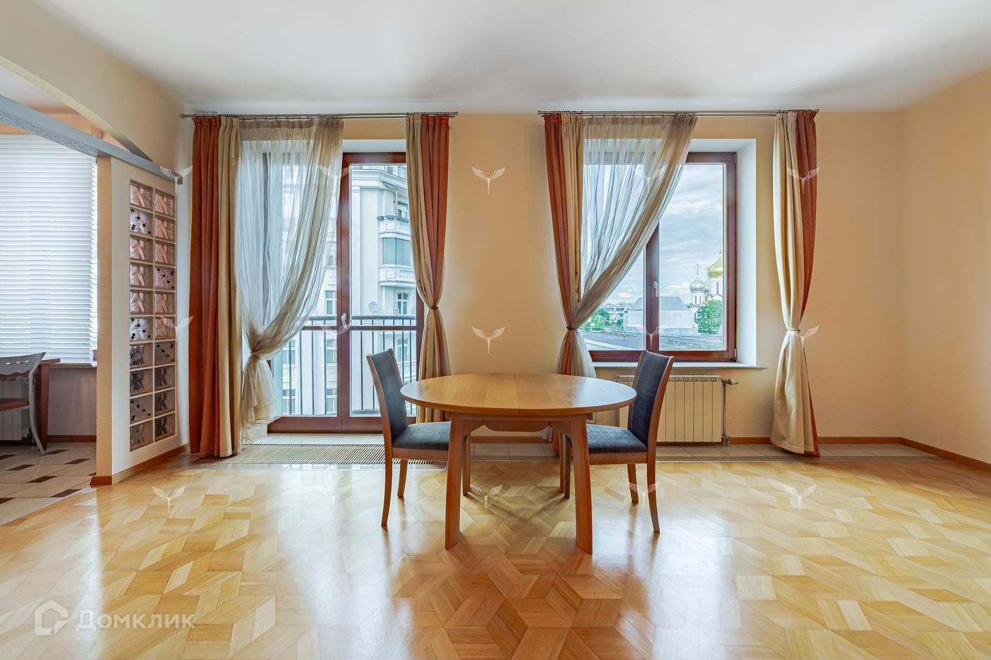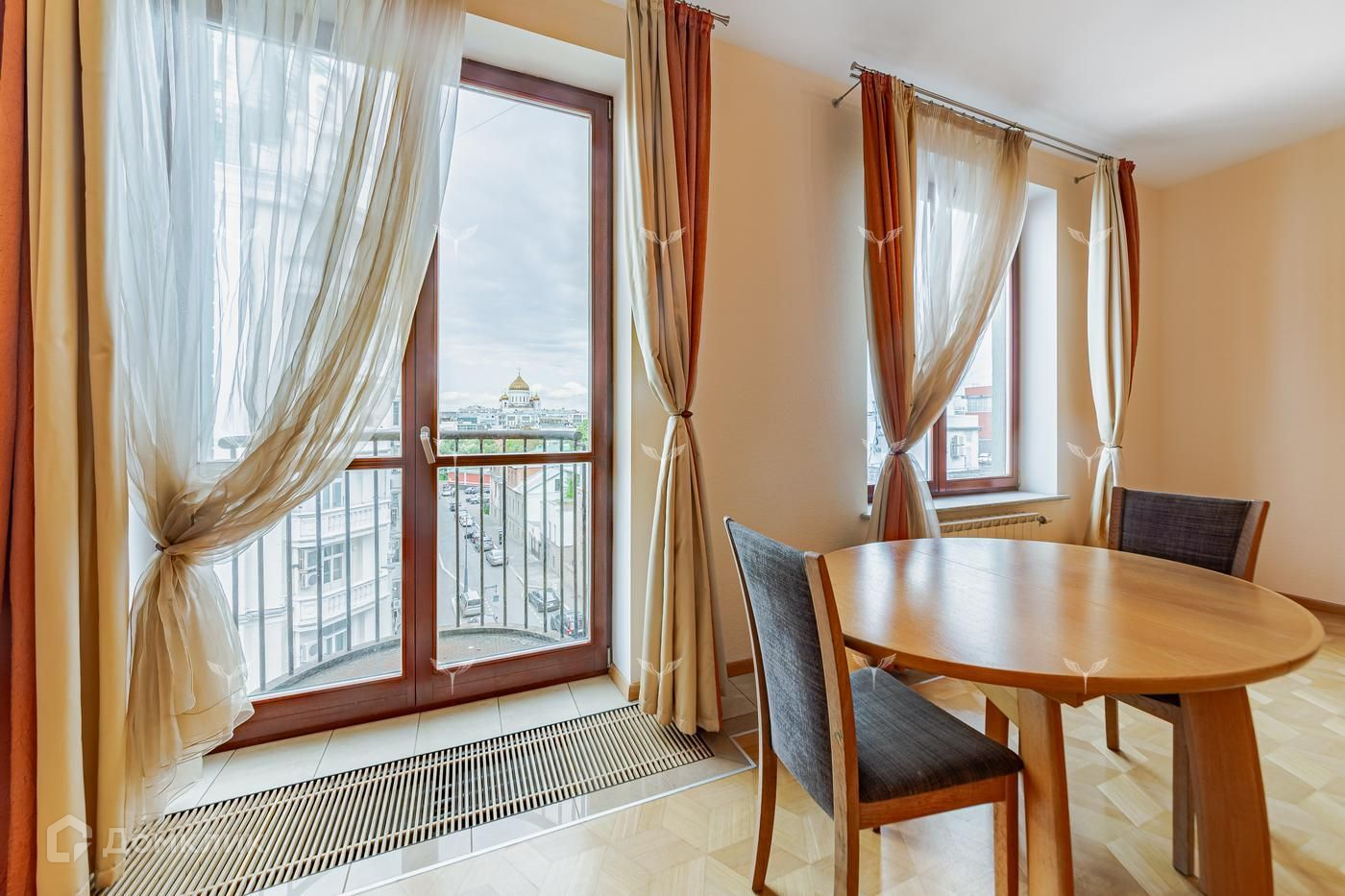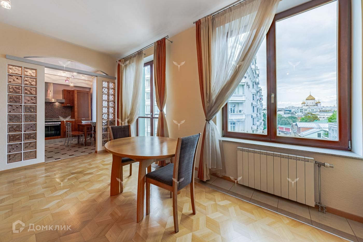 Из окон гостиной открываются виды на Храм Христа Спасителя, окна спален выходят в тихий зеленый двор.