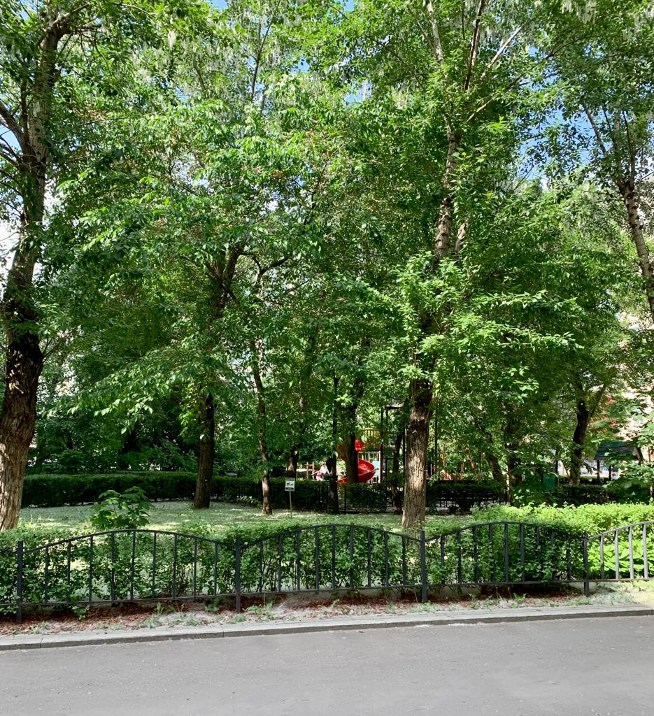Из окна кухни и комнаты с застекленным балконом открывается взор на зеленый скверик с детской площадкой.