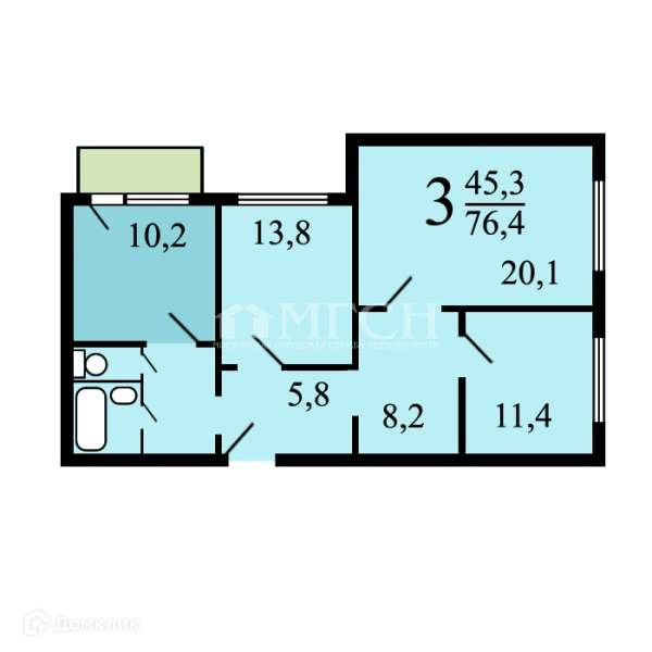Жилая площадь 45.3 м2