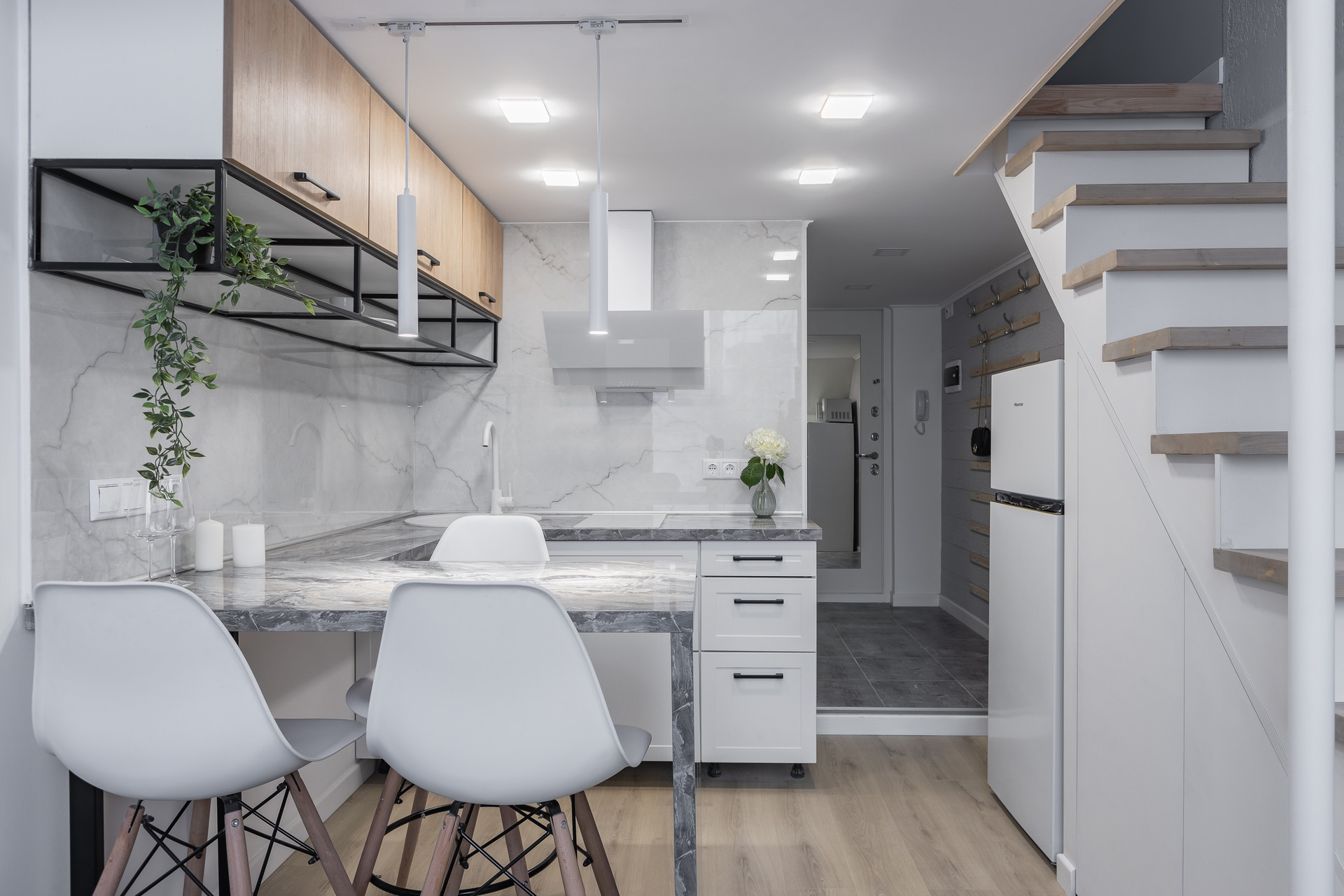 На первом этаже уютная кухня и гостиная.