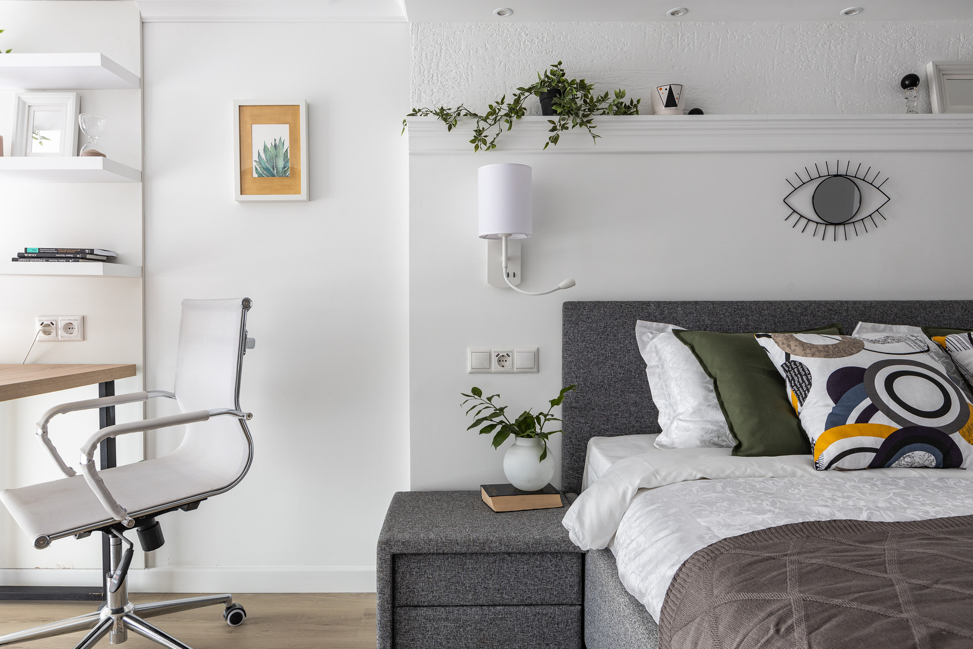 На втором уровне можно разместить полноценное рабочее место, а также спальню с большим гардеробом.