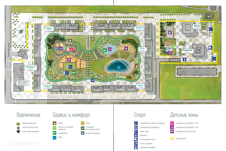 - Европейский подход к благоустройству от бюро WOWHaus: детские площадки для разных возрастов, спортивные площадки, площадки воркаута, дорожки для бега и пеших прогулок, скейтпарк, хоккейная площадка, площадка для выгула собак