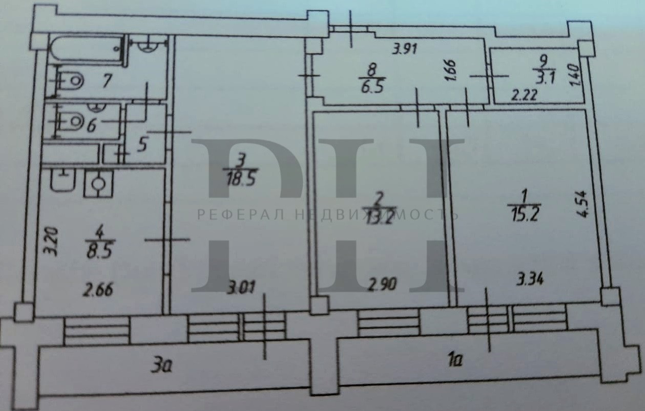 Общая площадь 77.4кв.м, жилая - 46.9 (18.5+13.2+15.2)кв.м, кухня - 8.5кв.м.