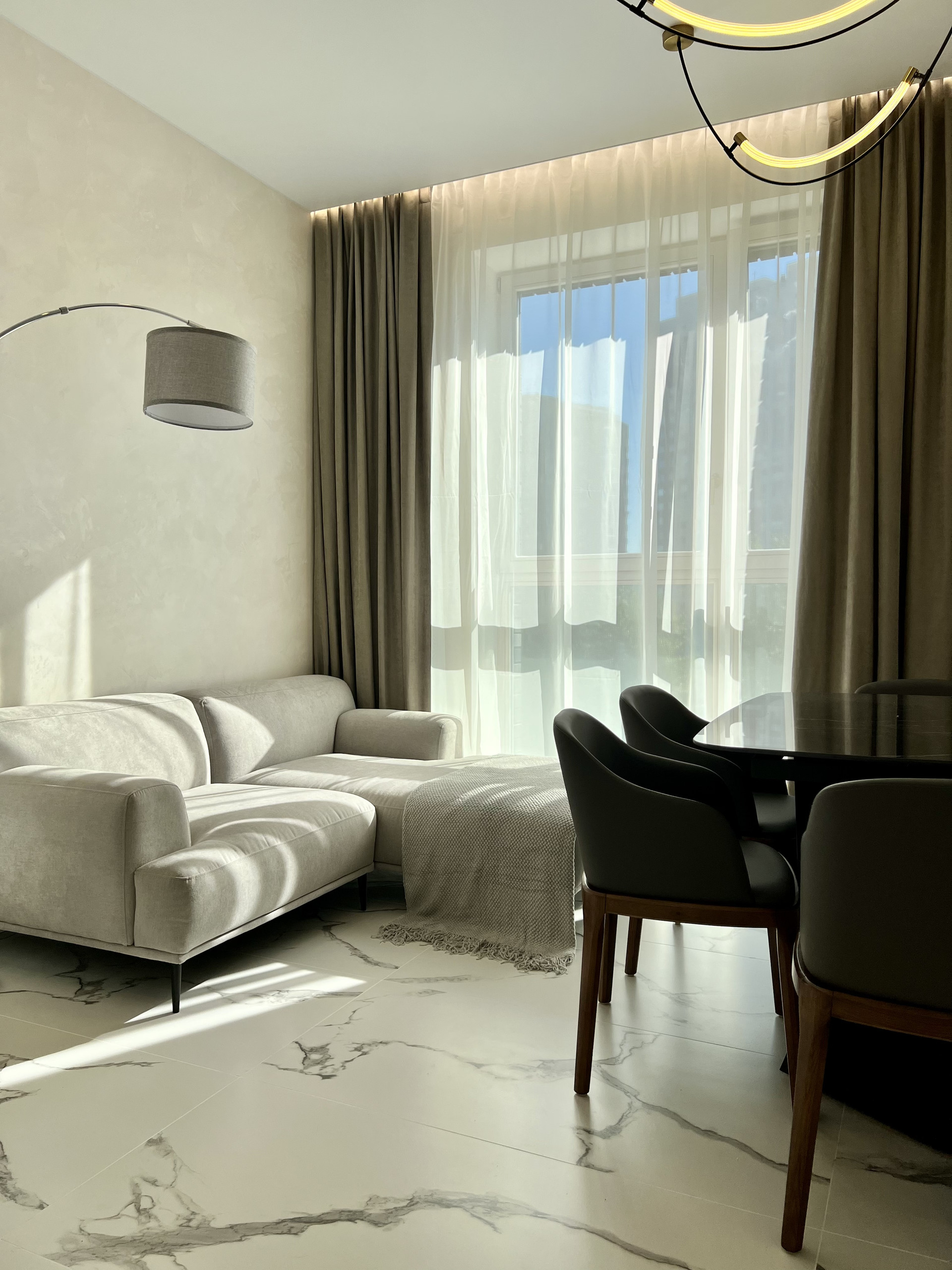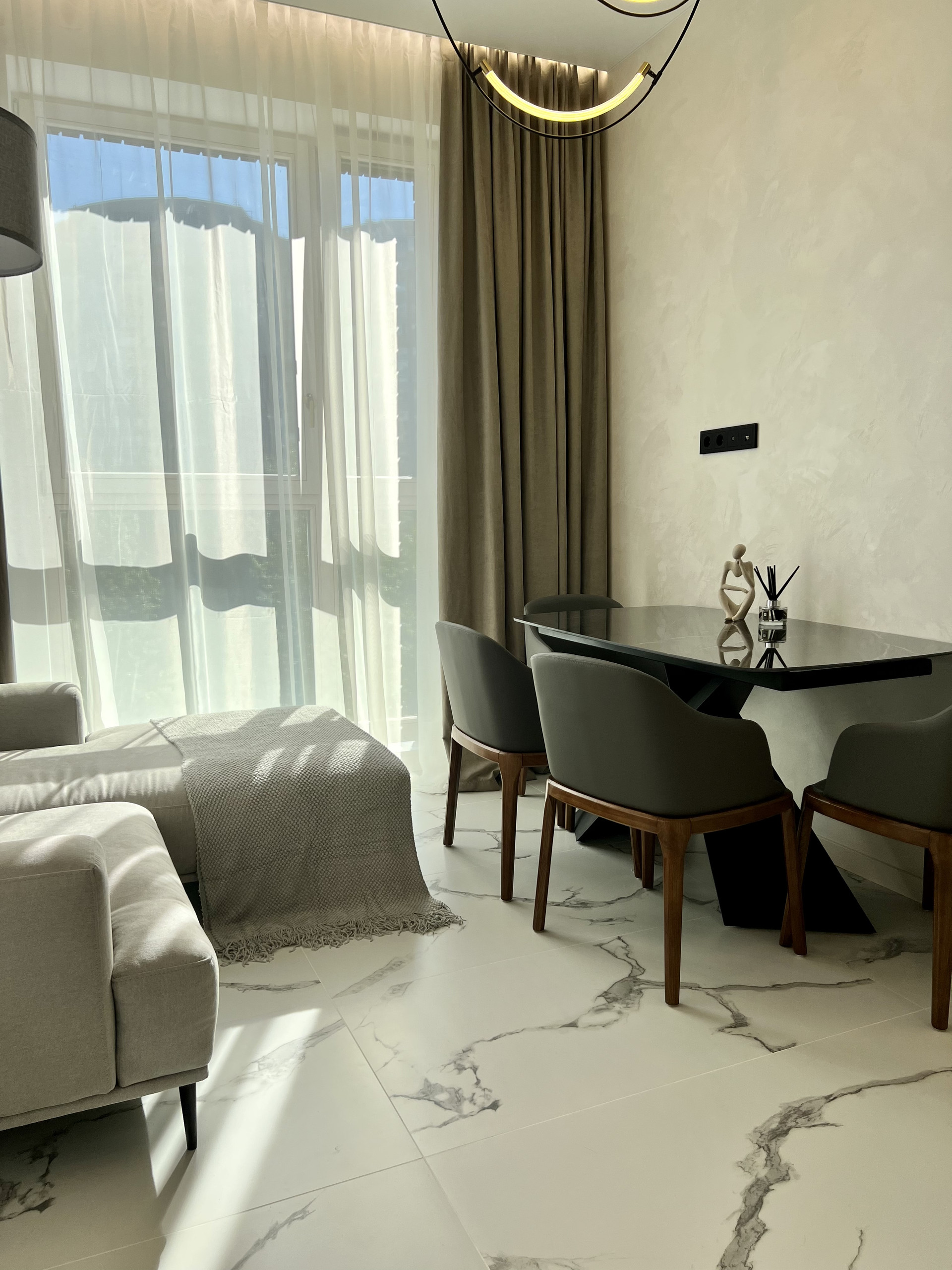 Использованы дорогие материалы керамогранит премиум класса, паркетная доска, фасады из натурального шпона и эмали, натуральный массив дерева в основании кухонной группы, мраморные столешницы и ещё много всего что не оставит вас равнодушными!