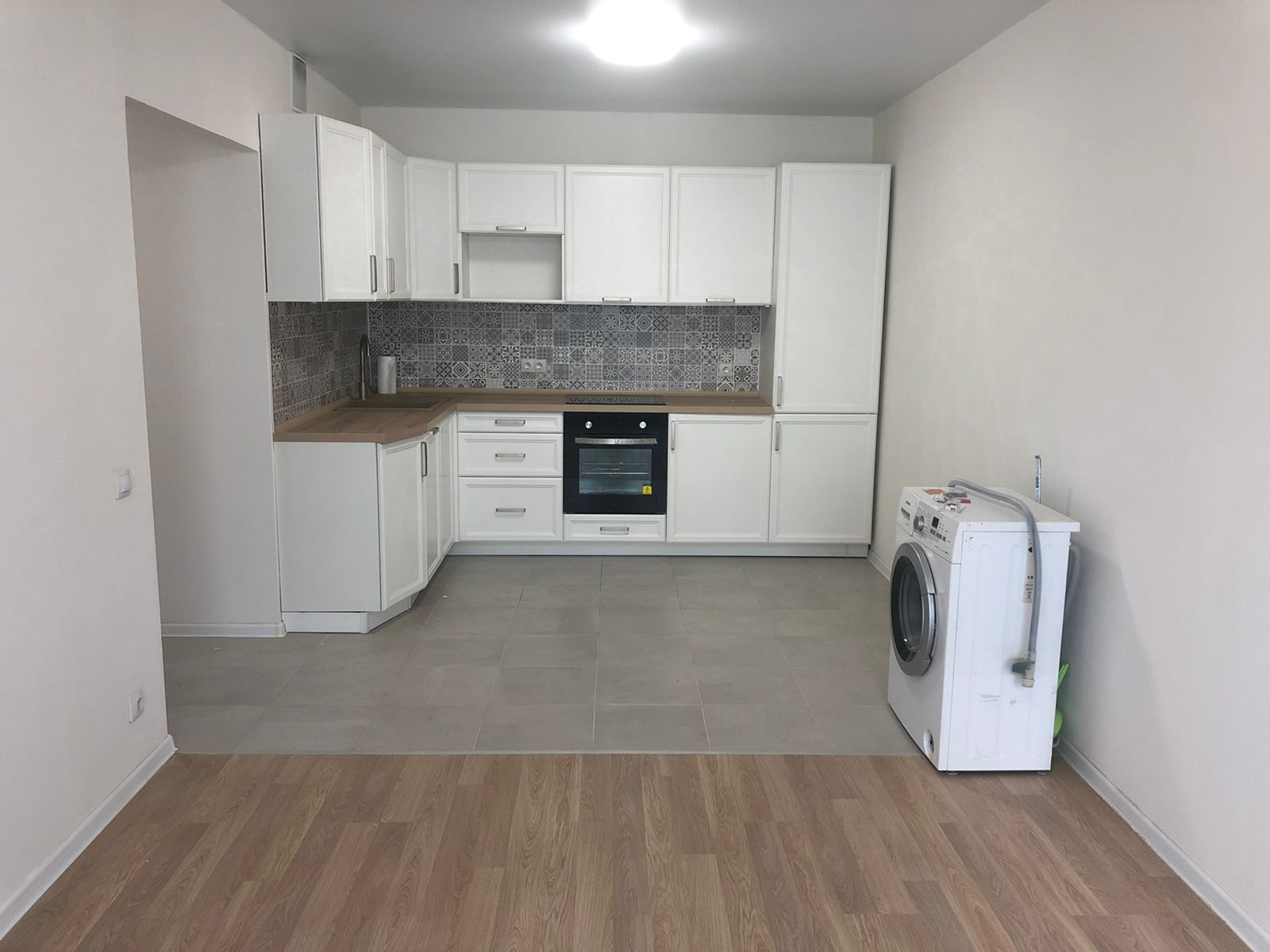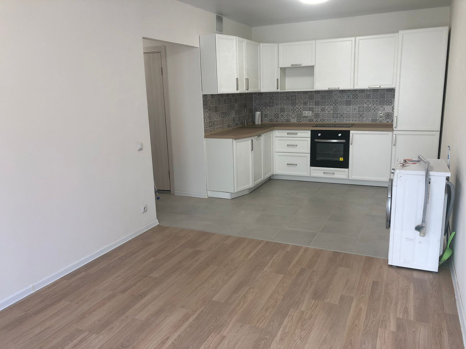 На кухне установлен кухонный гарнитур со встроенной техникой, есть стиральная машинка!