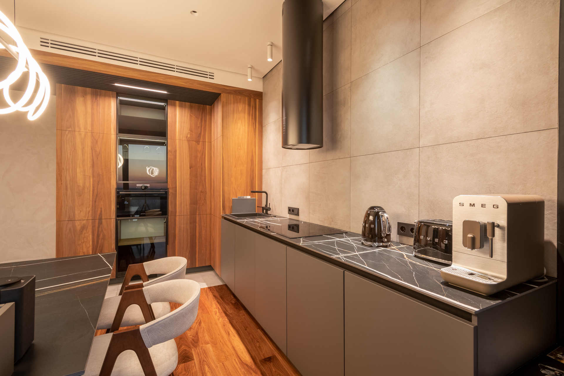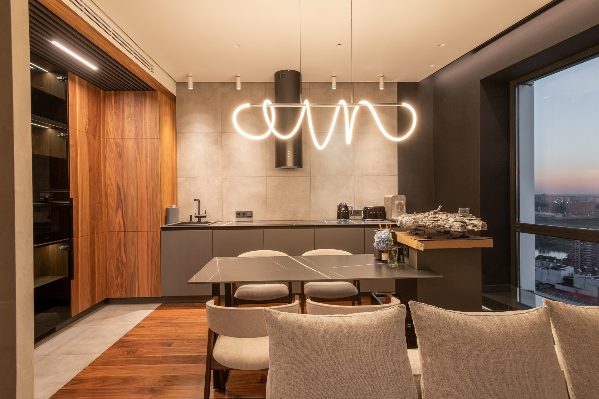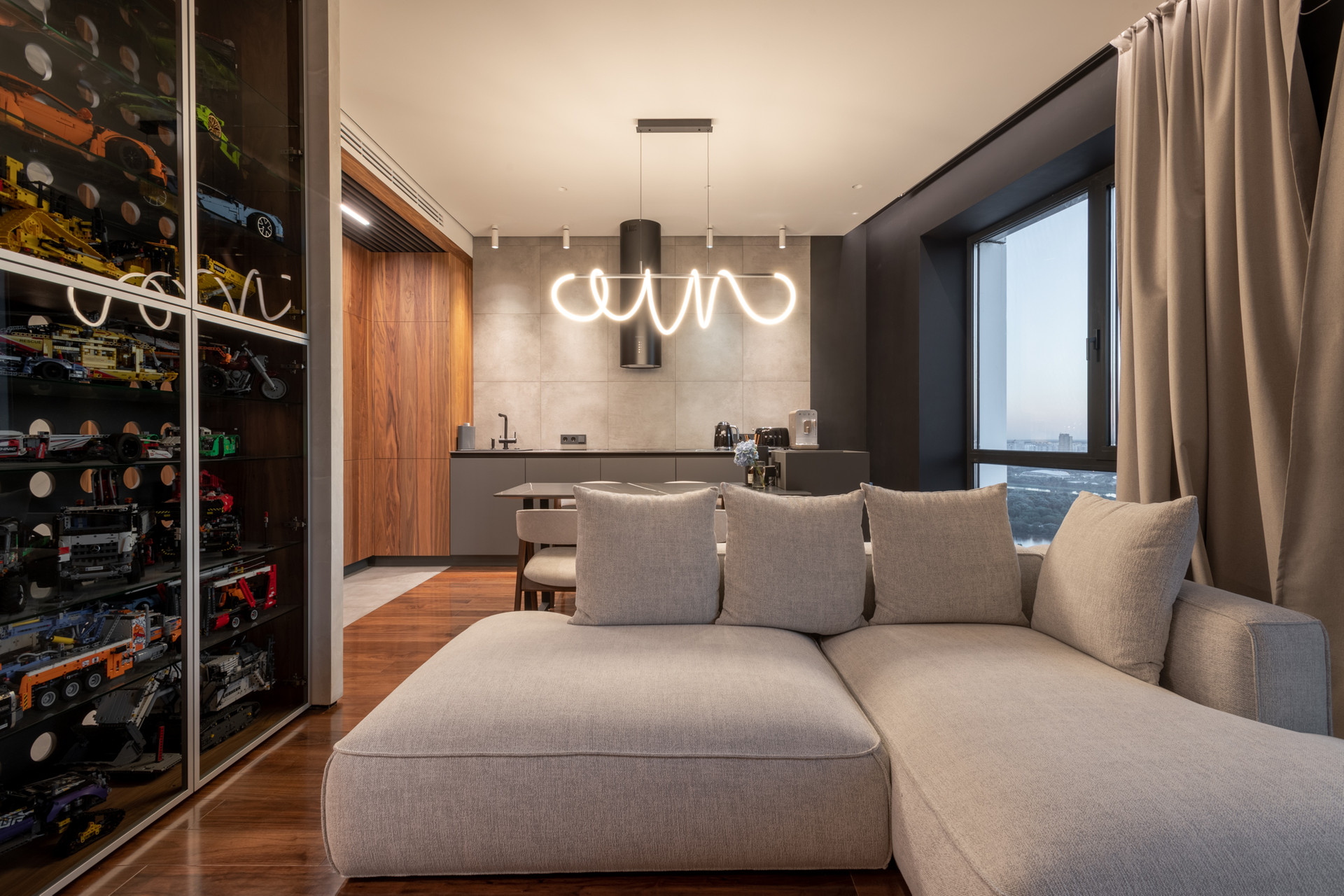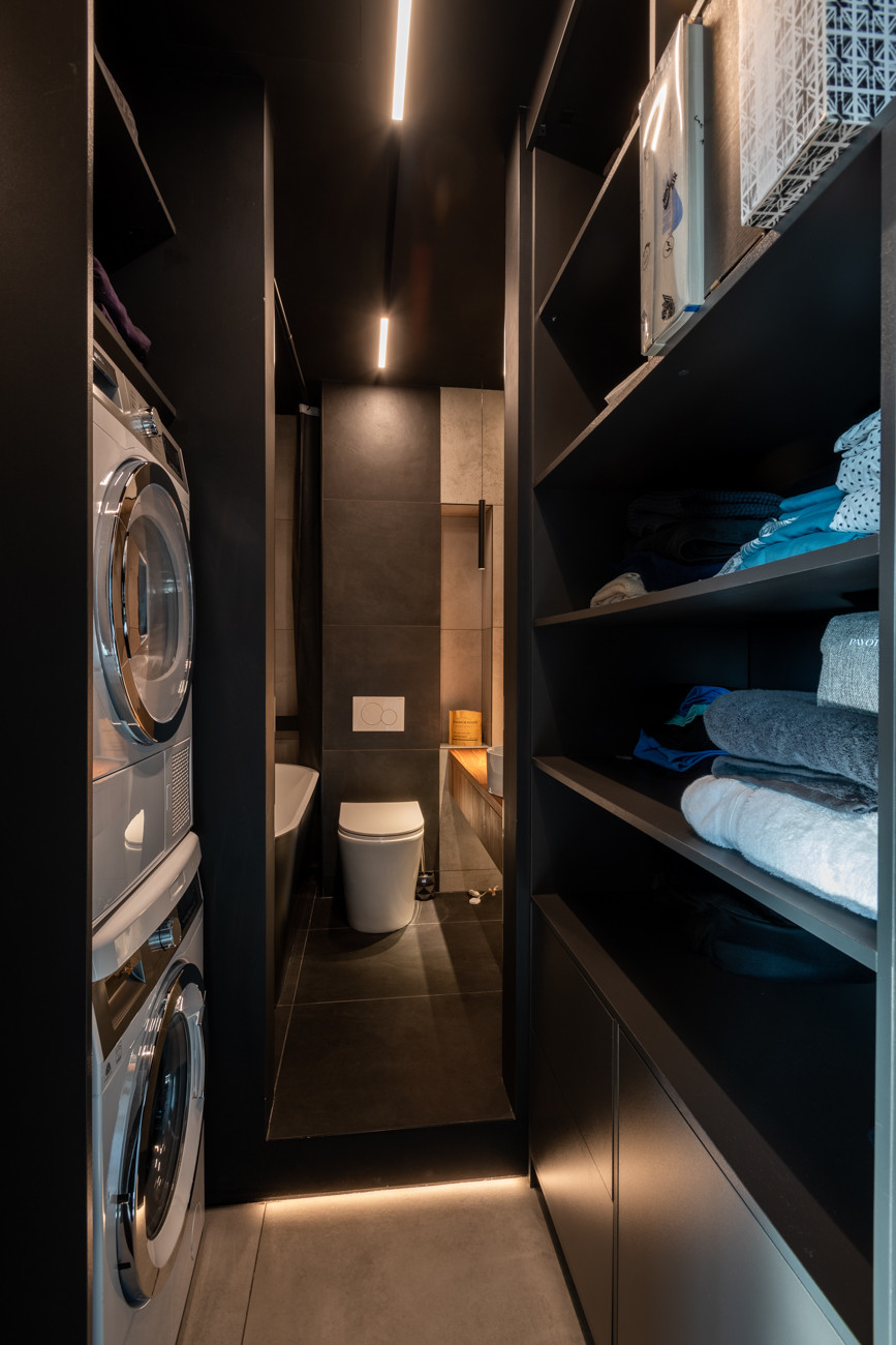 Планировка квартиры: просторная гостиная с кухонной зоной, спальня, санузел, постирочная. Высота потолков 3,1 м. Окна с панорамным остеклением открывают живописные виды на окрестности. Отделка продумана до мелочей: теплые полы, внутрипольные конвекторы с функцией принудительной конвекции, бесшумные кондиционеры, теневые плинтуса с контурной подсветкой, установлены измельчители и датчики протечки воды в мокрых зонах. Продуманное комфортное освещение – премиальный ЦентрСвет. Подключена система "Умный Дом". Вся мебель изготовлена под заказ, техника ведущих производителей – практически все остается в качестве приятного бонуса покупателю.