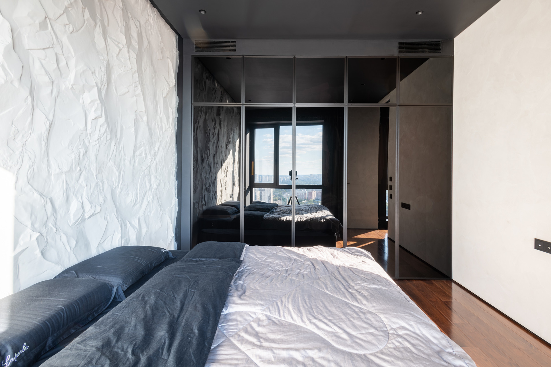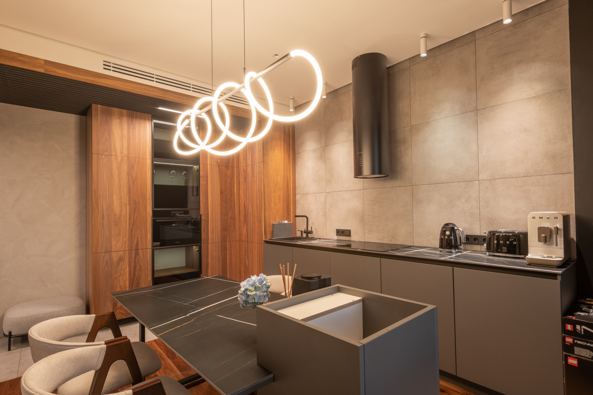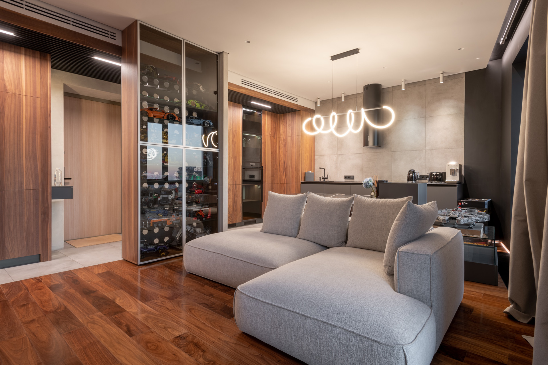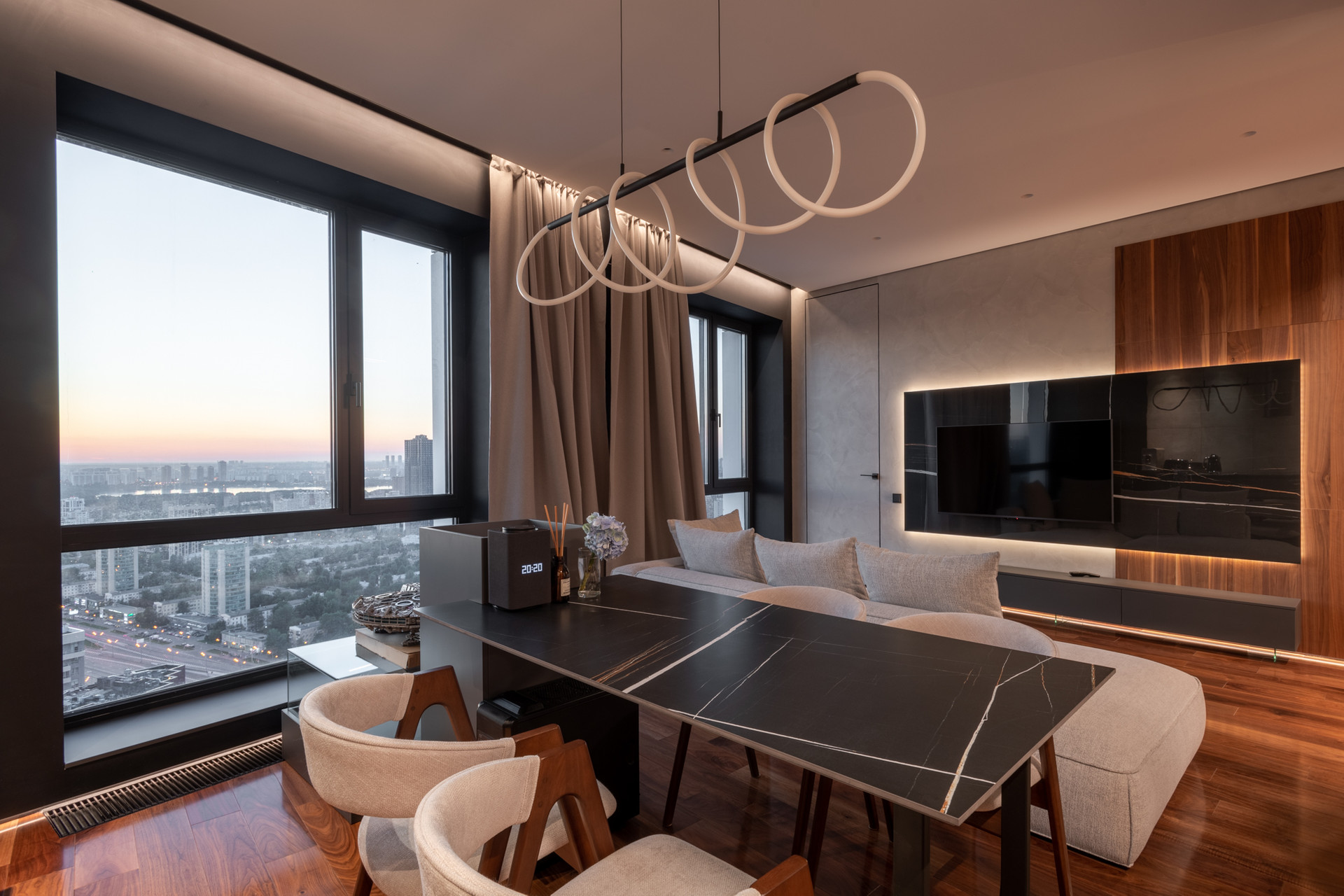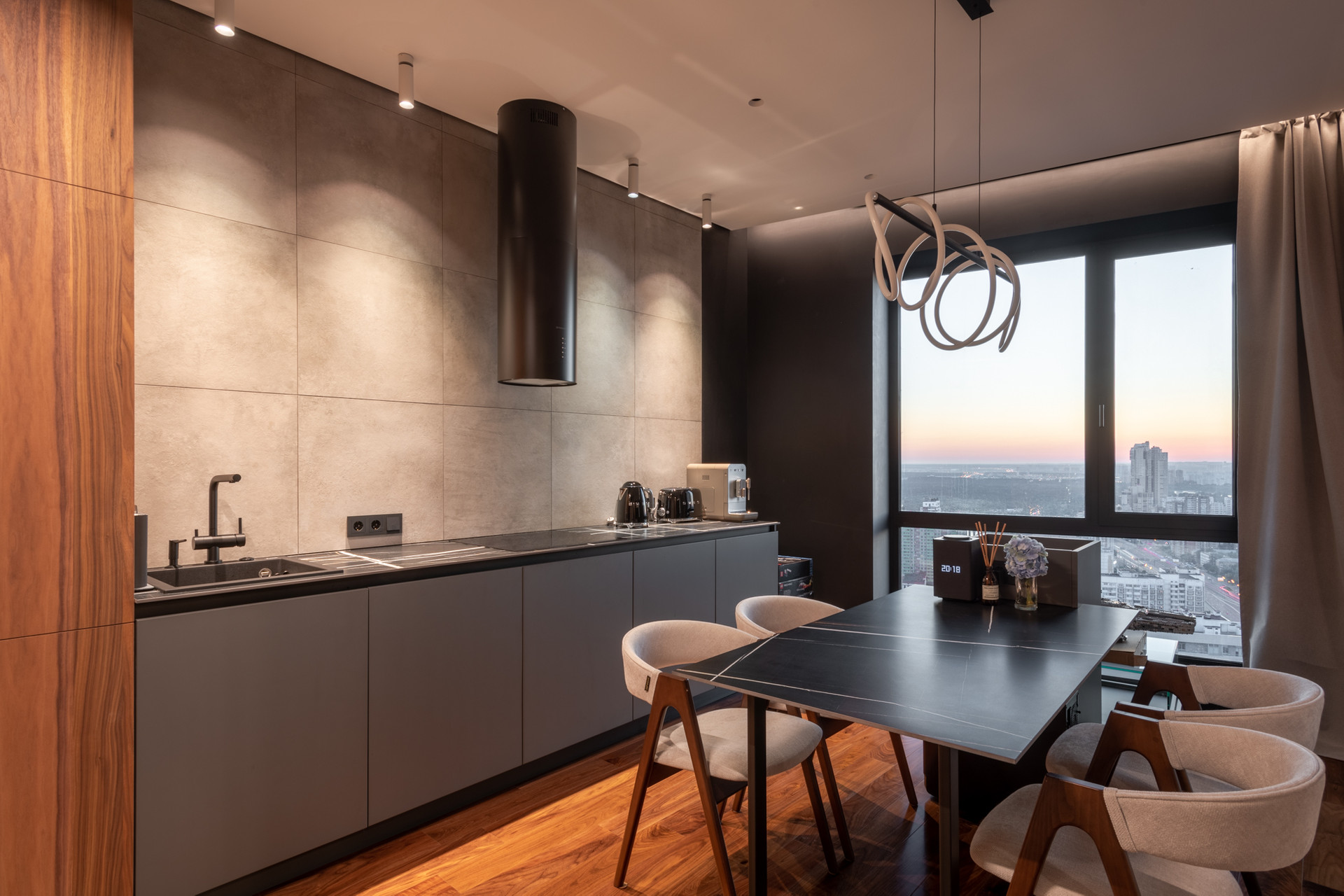 Планировка квартиры: просторная гостиная с кухонной зоной, спальня, санузел, постирочная. Высота потолков 3,1 м. Окна с панорамным остеклением открывают живописные виды на окрестности. Отделка продумана до мелочей: теплые полы, внутрипольные конвекторы с функцией принудительной конвекции, бесшумные кондиционеры, теневые плинтуса с контурной подсветкой, установлены измельчители и датчики протечки воды в мокрых зонах. Продуманное комфортное освещение – премиальный ЦентрСвет. Подключена система "Умный Дом". Вся мебель изготовлена под заказ, техника ведущих производителей – практически все остается в качестве приятного бонуса покупателю.