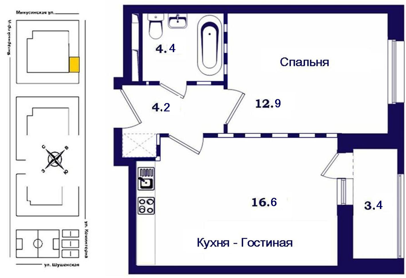 Жилая площадь 12.9 м2