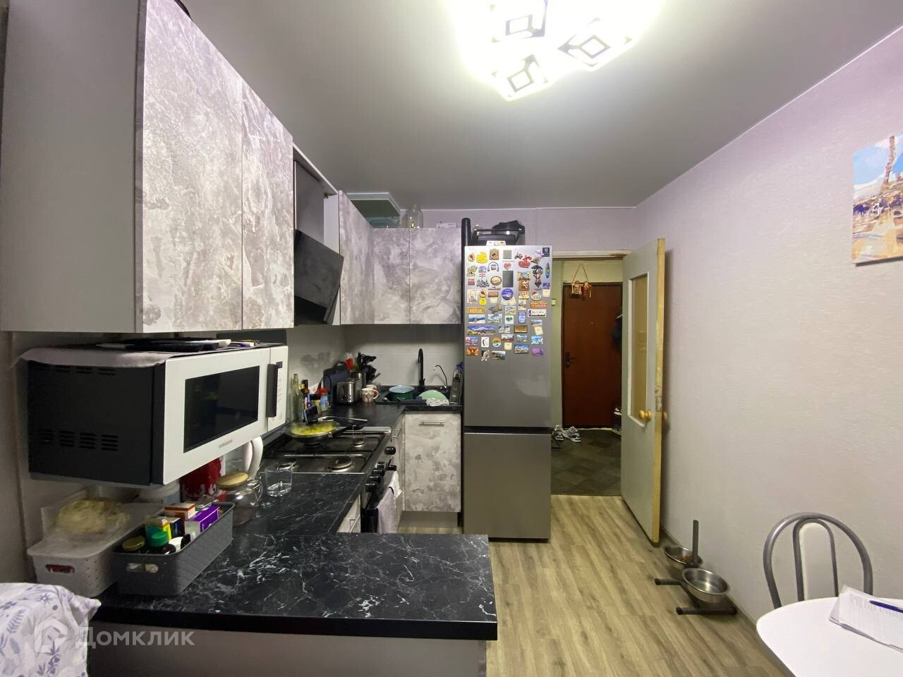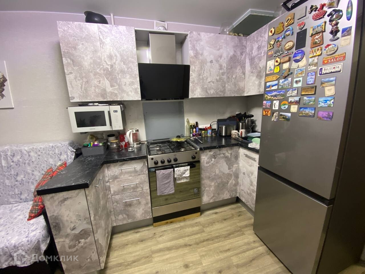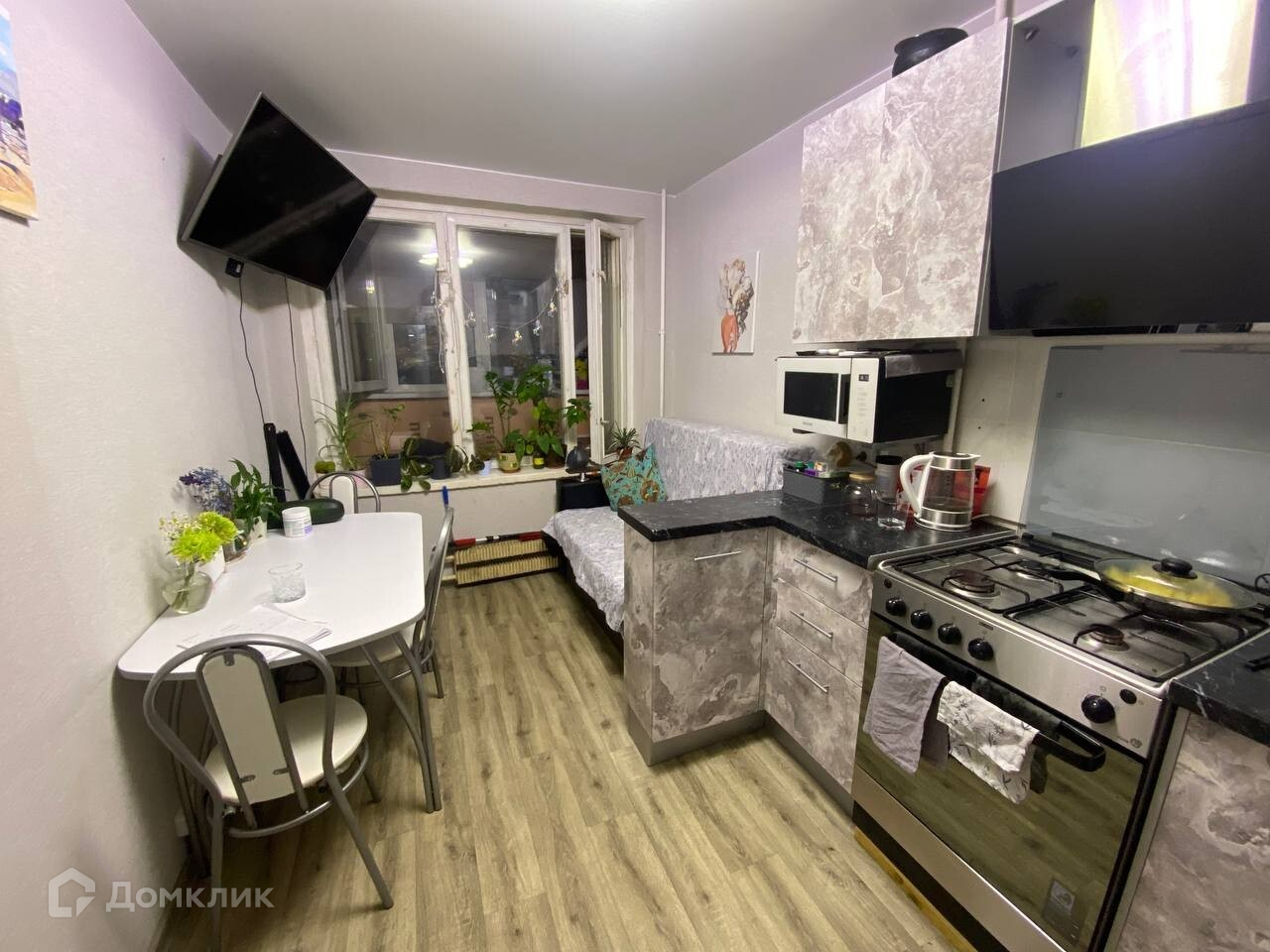 - встроенная кухня от производителя, со всей необходимой бытовой техникой духовка, микроволновая печь,