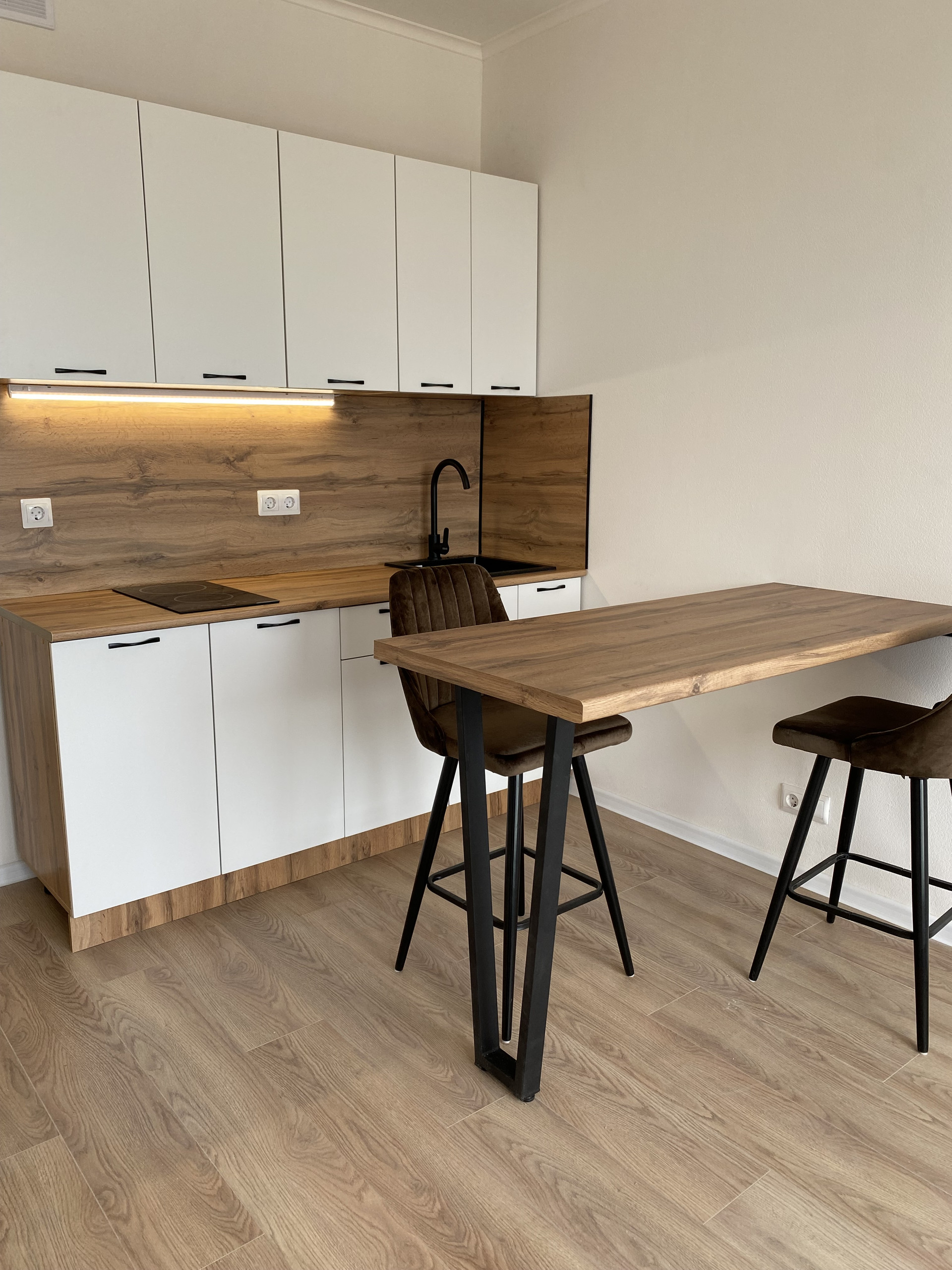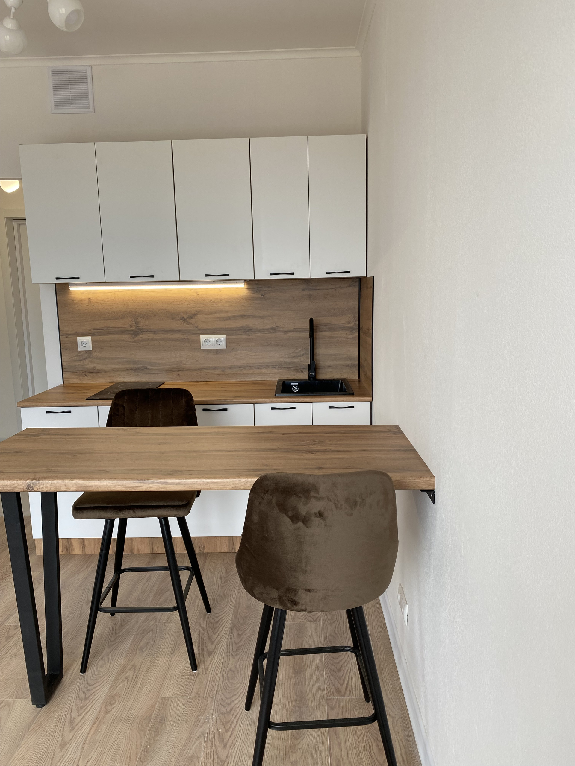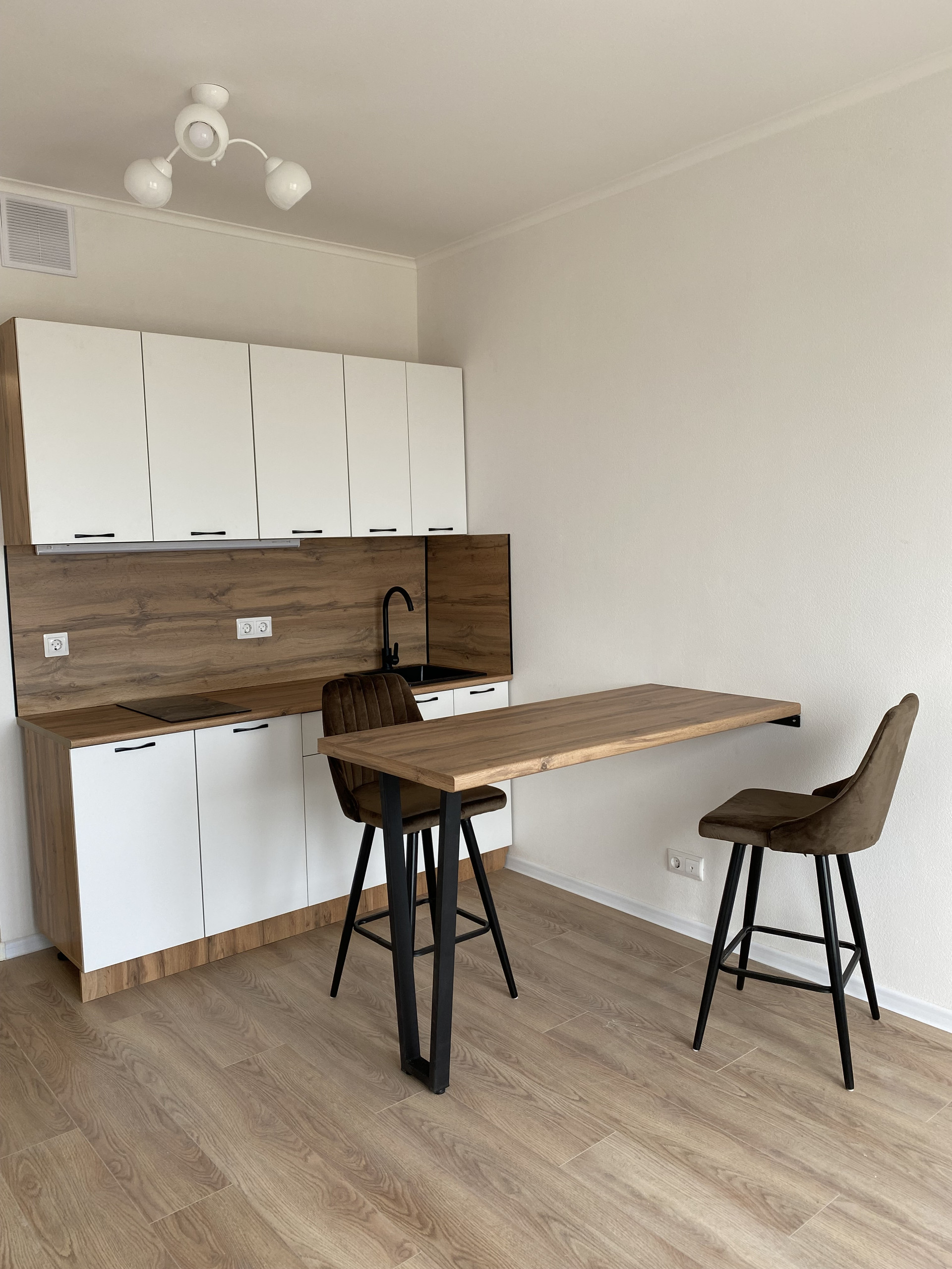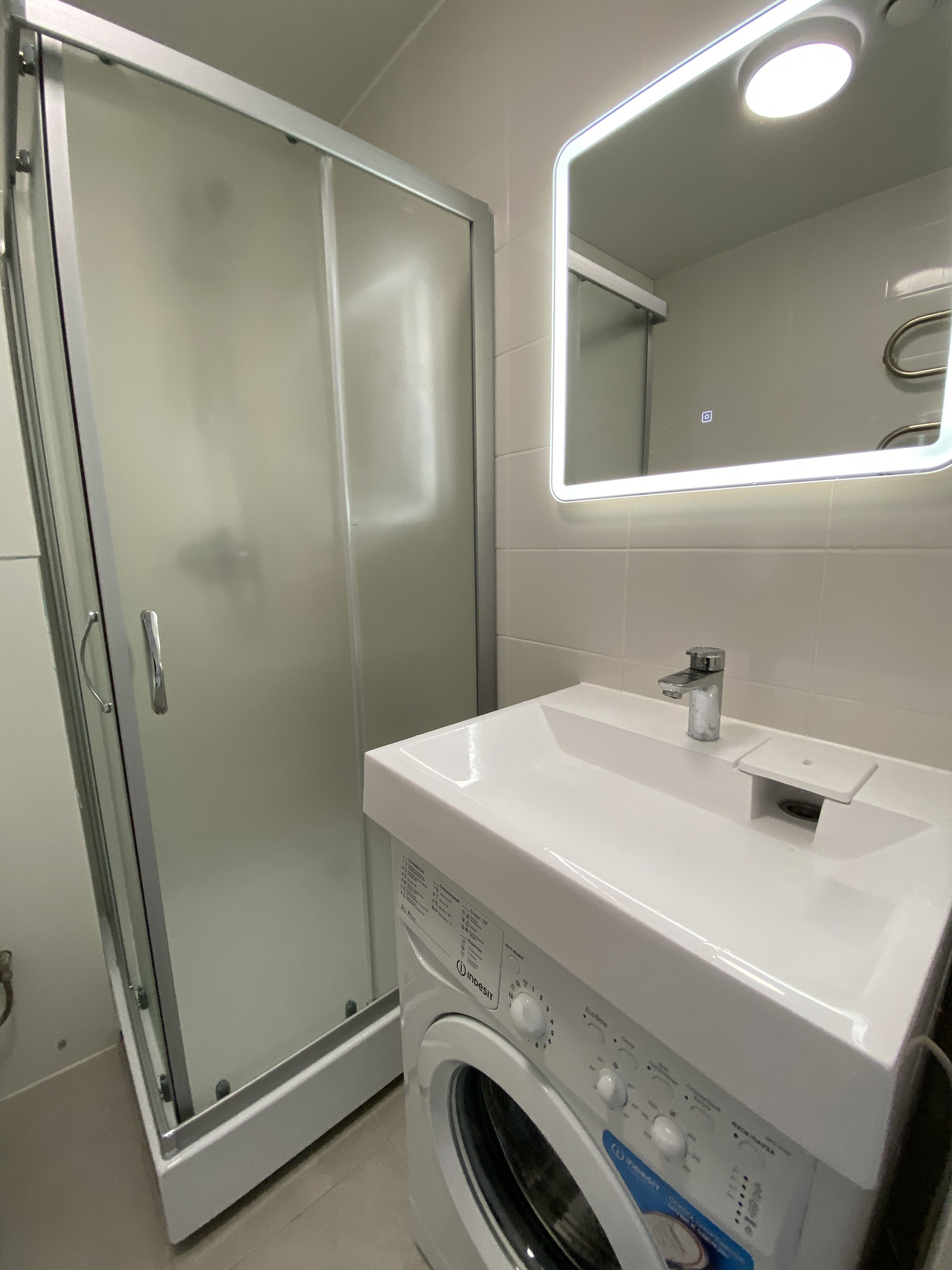 В квартире выполнен ремонт, установлена стильная кухня, барная стойка, барные комфортные стулья,  индукционная плита.   Установлена душевая кабина, новая стиральная машина, зеркало с подсветкой..