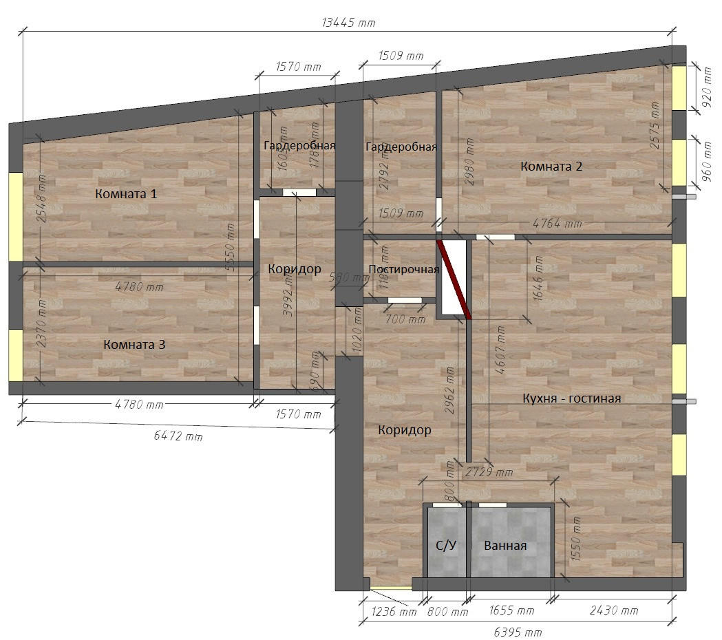 Жилая площадь 54.7 м2