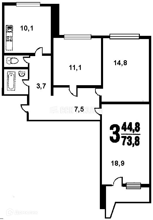 3-комнатная квартира, 74.3 м2, этаж 7 / 16, на продажу в Москве, Краснополянская улица, 6к2