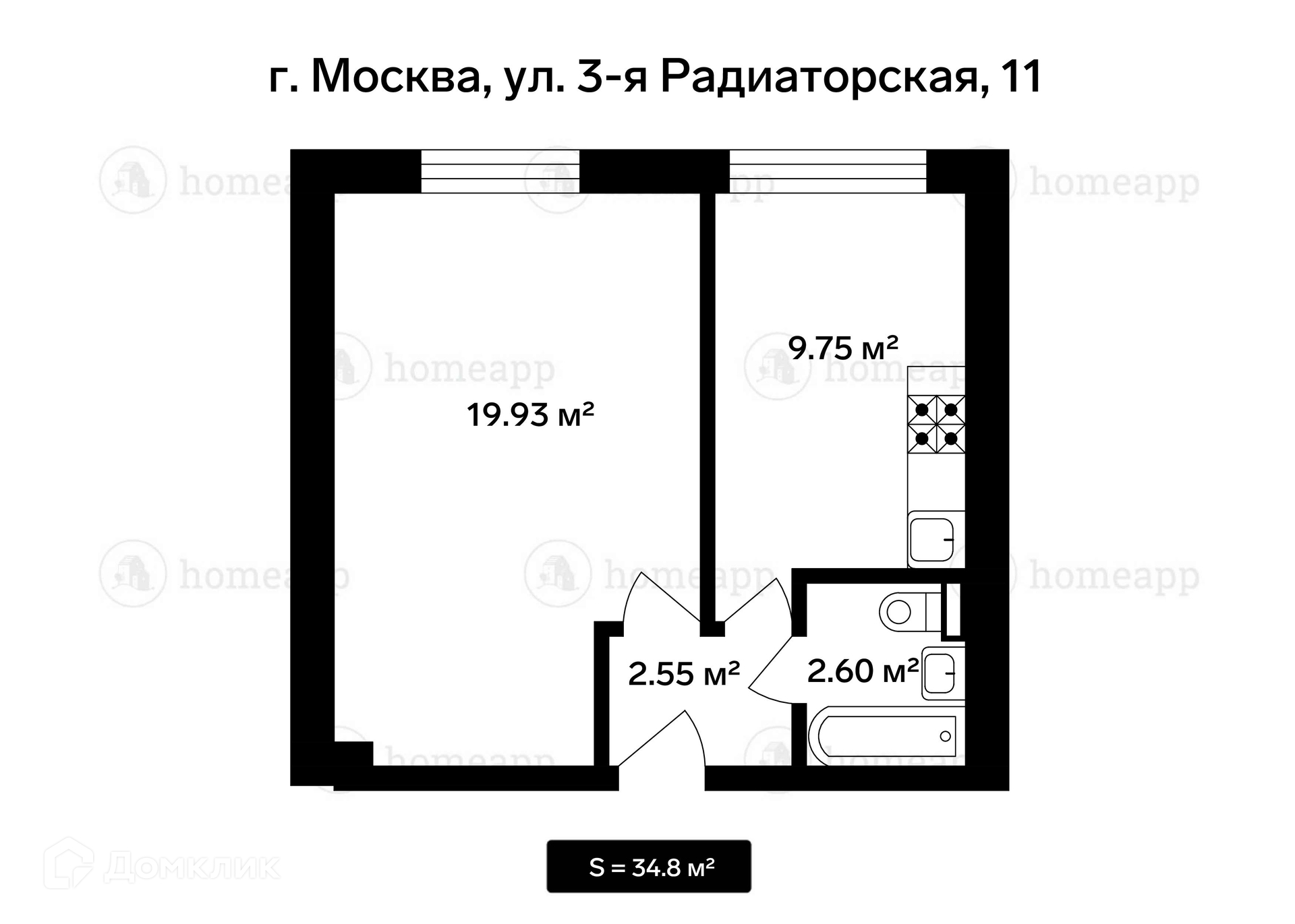 1-комнатная квартира, 34.4 м2, этаж 1 / 12, на продажу в Москве, 3-я Радиаторская улица, 11